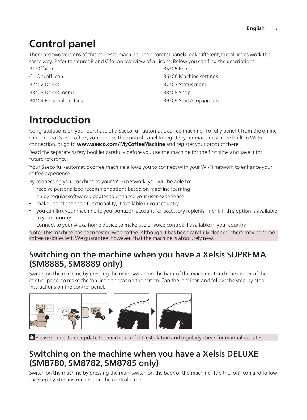 Congratulations on your purchase of a Saeco full-automatic coffee machine! To fully benefit from the online support that Saeco offers, you can use the control panel to register your machine via the built-in Wi-Fi connection, or go to www.saeco.com/MyCoffeeMachine and register your product there. Read the separate safety booklet carefully before you use the machine for the first time and save it for future reference. Your Saeco full-automatic coffee machine allows you to connect with your Wi-Fi network to enhance your coffee experience. By connecting your machine to your Wi-Fi network, you will be able to: - receive personalized recommendations based on machine learning - enjoy regular software updates to enhance your user experience - make use of the shop functionality, if available in your country - you can link your machine to your Amazon account for accessory replenishment, if this option is available in your country - connect to your Alexa home device to make use of voice control, if available in your country Note: This machine has been tested with coffee. Although it has been carefully cleaned, there may be some coffee residues left. We guarantee, however, that the machine is absolutely new.