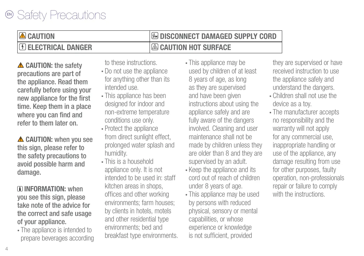 CAUTION ELECTRICAL DANGER CAUTION: the safety precautions are part of the appliance. Read them carefully before using your new appliance for the first time. Keep them in a place where you can find and refer to them later on. CAUTION: when you see this sign, please refer to the safety precautions to avoid possible harm and damage. INFORMATION: when you see this sign, please take note of the advice for the correct and safe usage of your appliance.