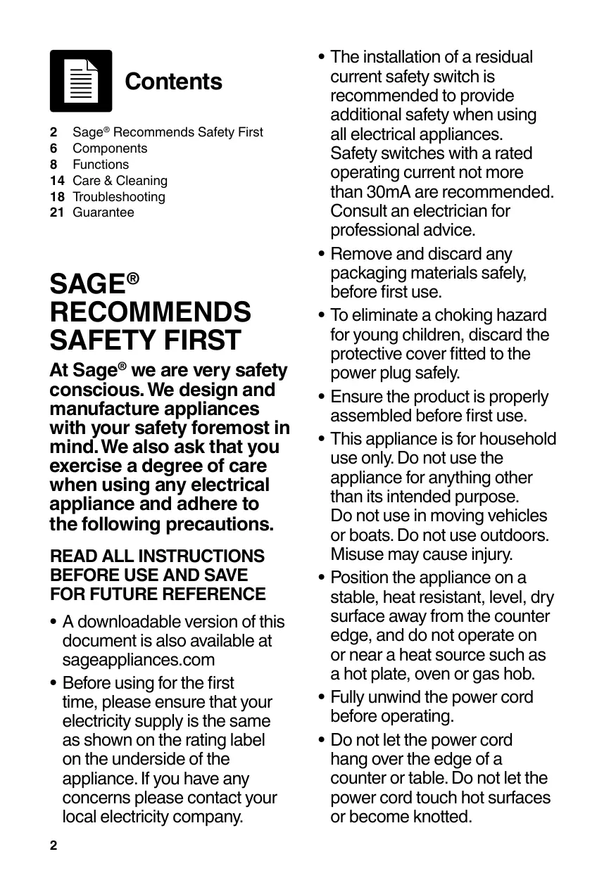 Sage® Recommends Safety First Components Functions Care & Cleaning Troubleshooting Guarantee At Sage® we are very safety conscious. We design and manufacture appliances with your safety foremost in mind. We also ask that you exercise a degree of care when using any electrical appliance and adhere to the following precautions.