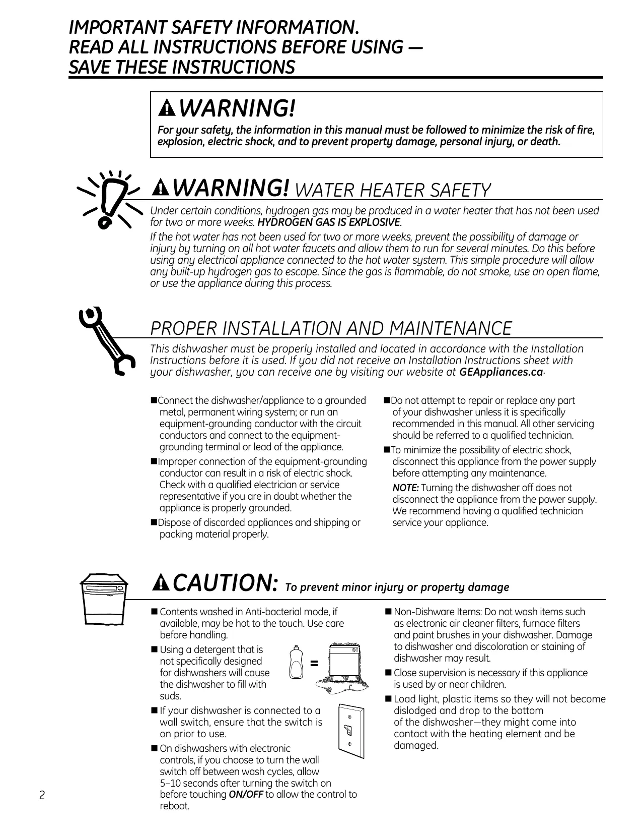 PROPER INSTALLATION AND MAINTENANCE This dishwasher must be properly installed and located in accordance with the Installation Instructions before it is used. If you did not receive an Installation Instructions sheet with your dishwasher, you can receive one by visiting our website at GEAppliances.ca. nConnect the dishwasher/appliance to a grounded metal, permanent wiring system; or run an equipment-grounding conductor with the circuit conductors and connect to the equipmentgrounding terminal or lead of the appliance. nImproper connection of the equipment-grounding conductor can result in a risk of electric shock. Check with a qualified electrician or service representative if you are in doubt whether the appliance is properly grounded. nDispose of discarded appliances and shipping or packing material properly.