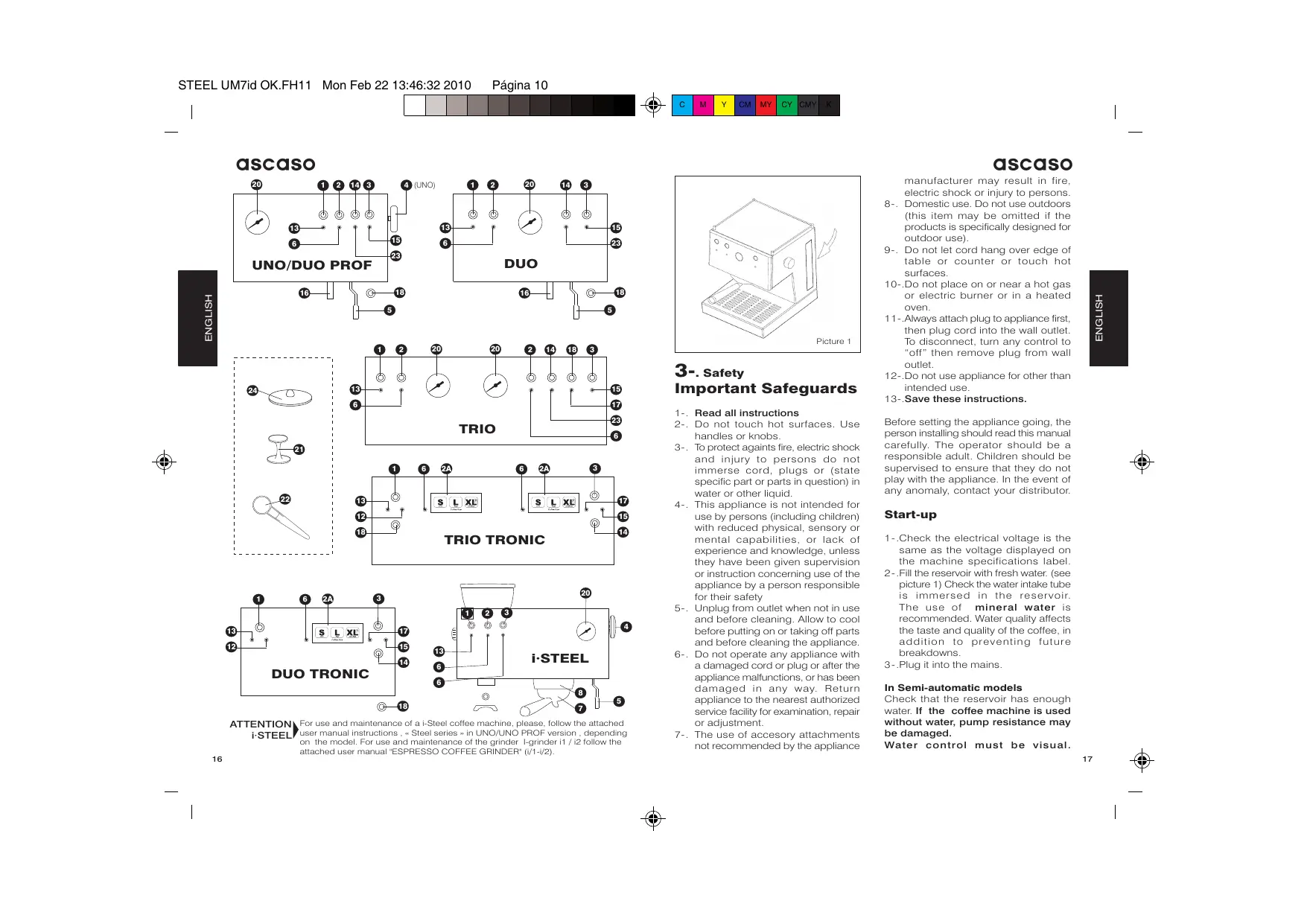 on the model. For use and maintenance of the grinder I-grinder i1 / i2 follow the attached user manual "ESPRESSO COFFEE GRINDER" (i/1-i/2). 1-. Read all instructions 2-. Do not touch hot surfaces. Use handles or knobs. 3-. To protect againts fire, electric shock and injury to persons do not immerse cord, plugs or (state specific part or parts in question) in water or other liquid. 4-. This appliance is not intended for use by persons (including children) with reduced physical, sensory or mental capabilities, or lack of experience and knowledge, unless they have been given supervision or instruction concerning use of the appliance by a person responsible for their safety 5-. Unplug from outlet when not in use and before cleaning. Allow to cool before putting on or taking off parts and before cleaning the appliance. 6-. Do not operate any appliance with a damaged cord or plug or after the appliance malfunctions, or has been damaged in any way. Return appliance to the nearest authorized service facility for examination, repair or adjustment. 7-. The use of accesory attachments not recommended by the appliance manufacturer may result in fire, electric shock or injury to persons. 8-. Domestic use. Do not use outdoors (this item may be omitted if the products is specifically designed for outdoor use). 9-. Do not let cord hang over edge of table or counter or touch hot surfaces. 10-.Do not place on or near a hot gas or electric burner or in a heated oven. 11-.Always attach plug to appliance first, then plug cord into the wall outlet. To disconnect, turn any control to off then remove plug from wall outlet. 12-.Do not use appliance for other than intended use. 13-.Save these instructions. ENGLISH ascaso Before setting the appliance going, the person installing should read this manual carefully. The operator should be a responsible adult. Children should be supervised to ensure that they do not play with the appliance. In the event of any anomaly, contact your distributor. Start-up