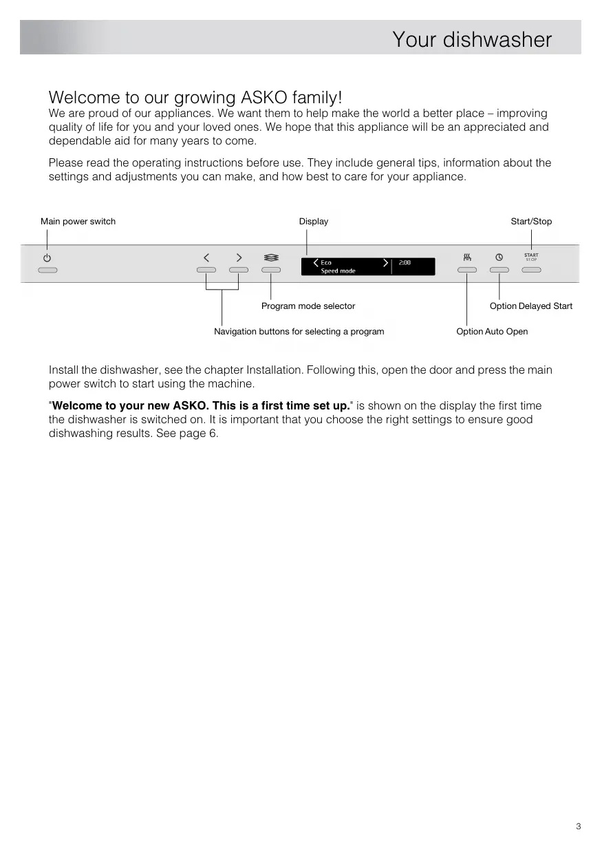 Your dishwasher Welcome to our growing ASKO family! We are proud of our appliances. We want them to help make the world a better place – improving quality of life for you and your loved ones. We hope that this appliance will be an appreciated and dependable aid for many years to come. Please read the operating instructions before use. They include general tips, information about the settings and adjustments you can make, and how best to care for your appliance. Main power switch Display Program mode selector Navigation buttons for selecting a program Start/Stop Option Delayed Start Option Auto Open Install the dishwasher, see the chapter Installation. Following this, open the door and press the main power switch to start using the machine. "Welcome to your new ASKO. This is a first time set up." is shown on the display the first time the dishwasher is switched on. It is important that you choose the right settings to ensure good dishwashing results. See page 6.
