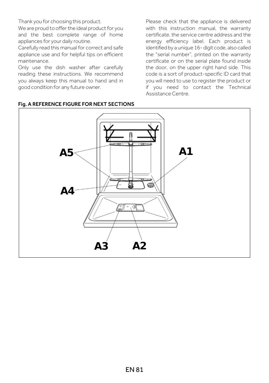 CLEANING AND MAINTENANCE (see reference figure "A" - "A5") Looking after your appliance correctly can extend its lifespan. CLEANING THE APPLIANCE’S EXTERIOR • Disconnect the machine from the power supply. • To clean the dishwasher outside, do not use solvents (degreasing action) neither abrasives, but only a cloth soaked with water.