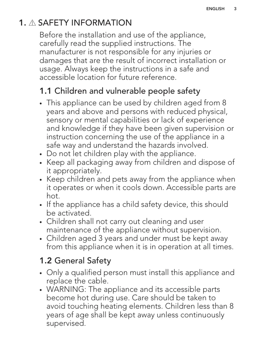 This appliance can be used by children aged from 8 years and above and persons with reduced physical, sensory or mental capabilities or lack of experience and knowledge if they have been given supervision or instruction concerning the use of the appliance in a safe way and understand the hazards involved. Do not let children play with the appliance. Keep all packaging away from children and dispose of it appropriately. Keep children and pets away from the appliance when it operates or when it cools down. Accessible parts are hot. If the appliance has a child safety device, this should be activated. Children shall not carry out cleaning and user maintenance of the appliance without supervision. Children aged 3 years and under must be kept away from this appliance when it is in operation at all times.