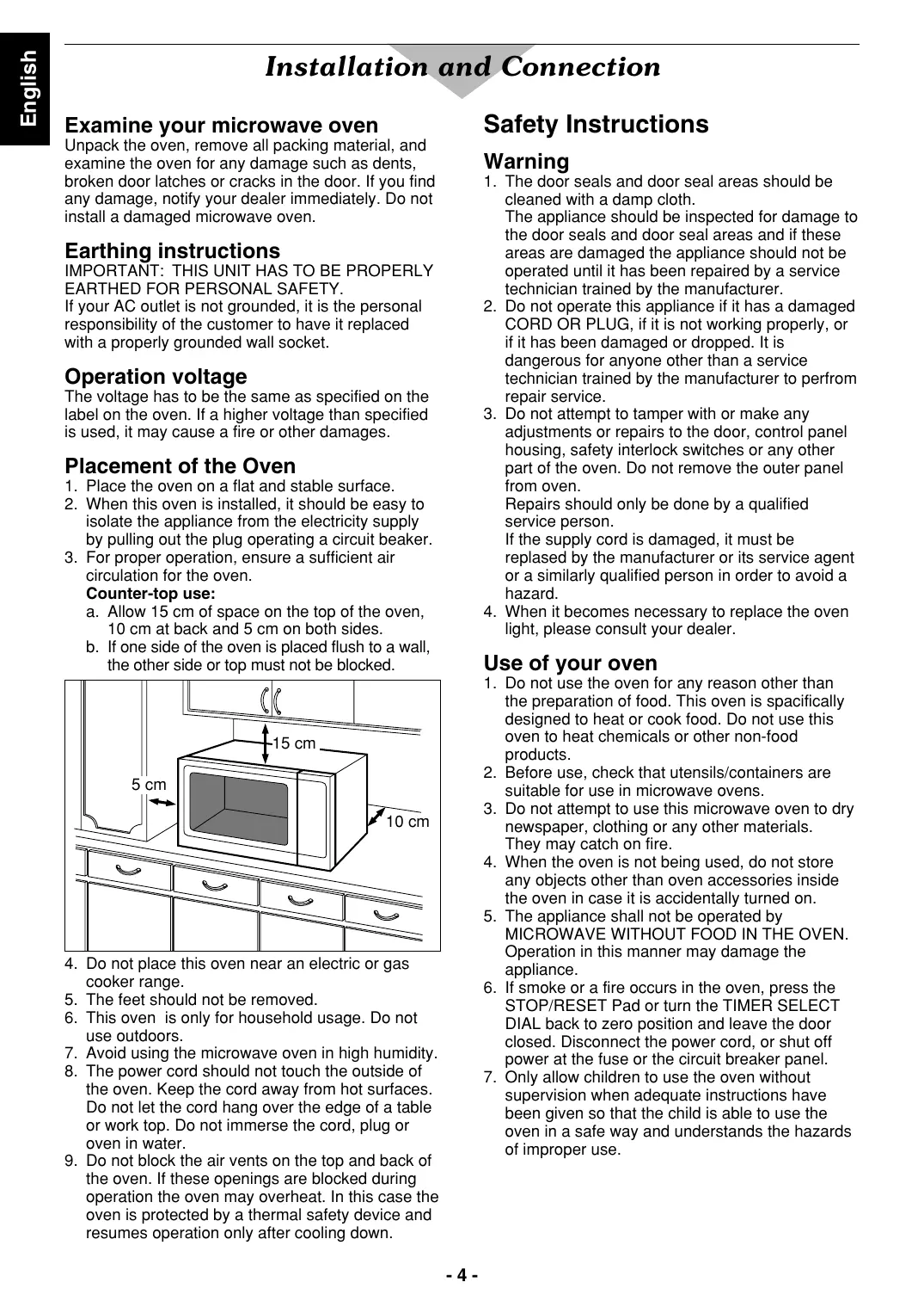 a. Allow 15 cm of space on the top of the oven, 10 cm at back and 5 cm on both sides.
