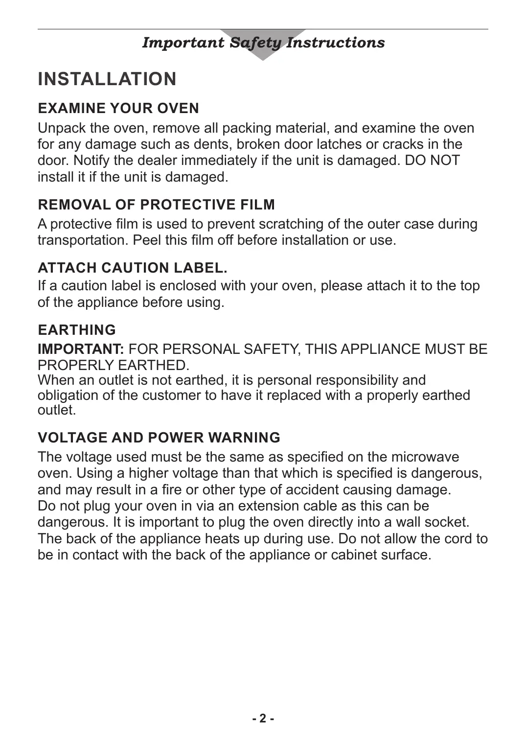 REMOVAL OF PROTECTIVE FILM A protective film is used to prevent scratching of the outer case during transportation. Peel this film off before installation or use. ATTACH CAUTION LABEL. If a caution label is enclosed with your oven, please attach it to the top of the appliance before using. EARTHING IMPORTANT: FOR PERSONAL SAFETY, THIS APPLIANCE MUST BE PROPERLY EARTHED. When an outlet is not earthed, it is personal responsibility and obligation of the customer to have it replaced with a properly earthed outlet. VOLTAGE AND POWER WARNING The voltage used must be the same as specified on the microwave oven. Using a higher voltage than that which is specified is dangerous, and may result in a fire or other type of accident causing damage. Do not plug your oven in via an extension cable as this can be dangerous. It is important to plug the oven directly into a wall socket. The back of the appliance heats up during use. Do not allow the cord to be in contact with the back of the appliance or cabinet surface.