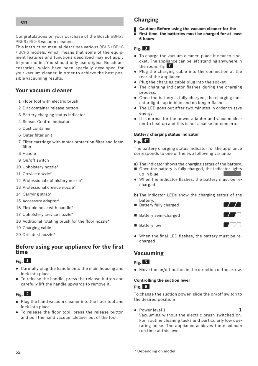 Congratulations on your purchase of the Bosch BBH5 / BBH6 / BCH6 vacuum cleaner. This instruction manual describes various BBH5 / BBH6 / BCH6 models, which means that some of the equipment features and functions described may not apply to your model. You should only use original Bosch accessories, which have been specially developed for your vacuum cleaner, in order to achieve the best possible vacuuming results. Description de l'appareil 1 Brosse pour sols avec électrobrosse 2 Bouton de déverrouillage du collecteur de saletés 3 Indicateur de l'état de charge de la batterie 4 Indicateur Sensor Control 5 Collecteur de poussières