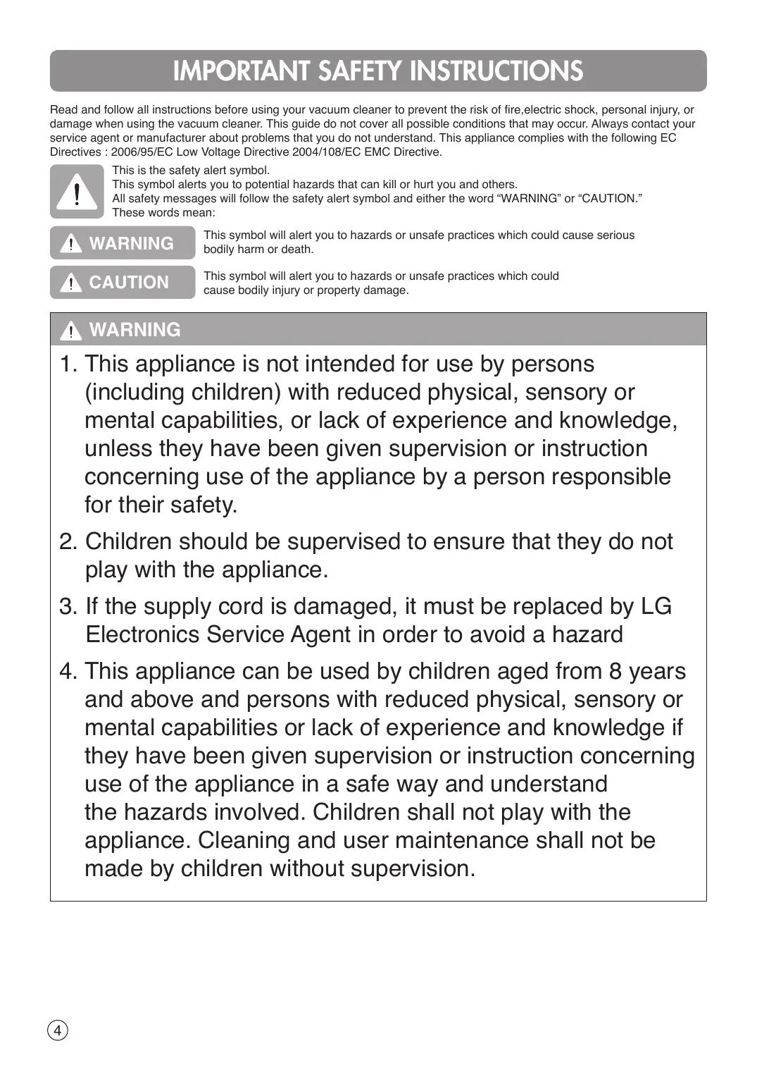 Read and follow all instructions before using your vacuum cleaner to prevent the risk of fire,electric shock, personal injury, or damage when using the vacuum cleaner. This guide do not cover all possible conditions that may occur. Always contact your service agent or manufacturer about problems that you do not understand. This appliance complies with the following EC Directives : 2006/95/EC Low Voltage Directive 2004/108/EC EMC Directive. This is the safety alert symbol. This symbol alerts you to potential hazards that can kill or hurt you and others. All safety messages will follow the safety alert symbol and either the word “WARNING” or “CAUTION.” These words mean: WARNING This symbol will alert you to hazards or unsafe practices which could cause serious bodily harm or death. CAUTION This symbol will alert you to hazards or unsafe practices which could cause bodily injury or property damage. WARNING