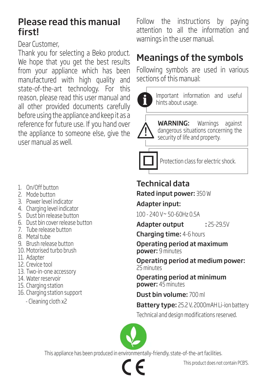 Operating period at maximum power: 9 minutes Operating period at medium power: 25 minutes Operating period at minimum power: 45 minutes Dust bin volume: 700 ml Battery type: 25.2 V, 2000mAH Li-ion battery Technical and design modifications reserved.