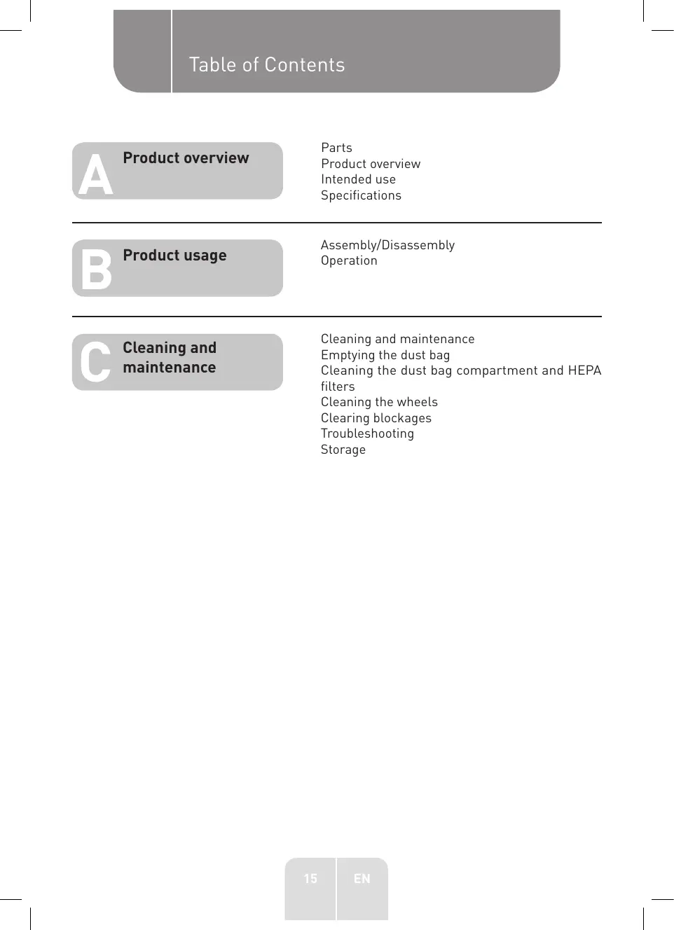 Parts Product overview Intended use Specifications Product overview Assembly/Disassembly Operation Product usage Cleaning and maintenance Emptying the dust bag Cleaning the dust bag compartment and HEPA filters Cleaning the wheels Clearing blockages Troubleshooting Storage Cleaning and maintenance