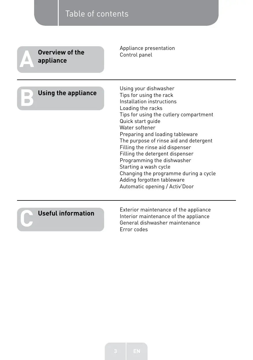 Tips for using the rack Installation instructions Loading the racks Tips for using the cutlery compartment Quick start guide Water softener Preparing and loading tableware The purpose of rinse aid and detergent Filling the rinse aid dispenser Filling the detergent dispenser Programming the dishwasher Starting a wash cycle Changing the programme during a cycle Adding forgotten tableware Automatic opening / Activ'Door