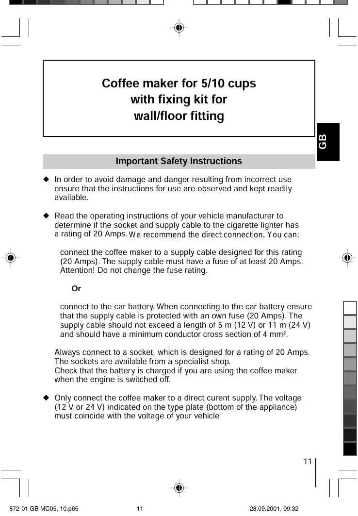 ◆ In order to avoid damage and danger resulting from incorrect use ensure that the instructions for use are observed and kept readily available. ◆ Read the operating instructions of your vehicle manufacturer to determine if the socket and supply cable to the cigarette lighter has a rating of 20 Amps. We If this is not the case you can: recommend the direct connection. You can: connect the coffee maker to a supply cable designed for this rating (20 Amps). The supply cable must have a fuse of at least 20 Amps. Attention! Do not change the fuse rating. Or connect to the car battery. When connecting to the car battery ensure that the supply cable is protected with an own fuse (20 Amps). The supply cable should not exceed a length of 5 m (12 V) or 11 m (24 V) and should have a minimum conductor cross section of 4 mm². Always connect to a socket, which is designed for a rating of 20 Amps. The sockets are available from a specialist shop. Check that the battery is charged if you are using the coffee maker when the engine is switched off. ◆ Only connect the coffee maker to a direct curent supply. The voltage (12 V or 24 V) indicated on the type plate (bottom of the appliance) must coincide with the voltage of your vehicle