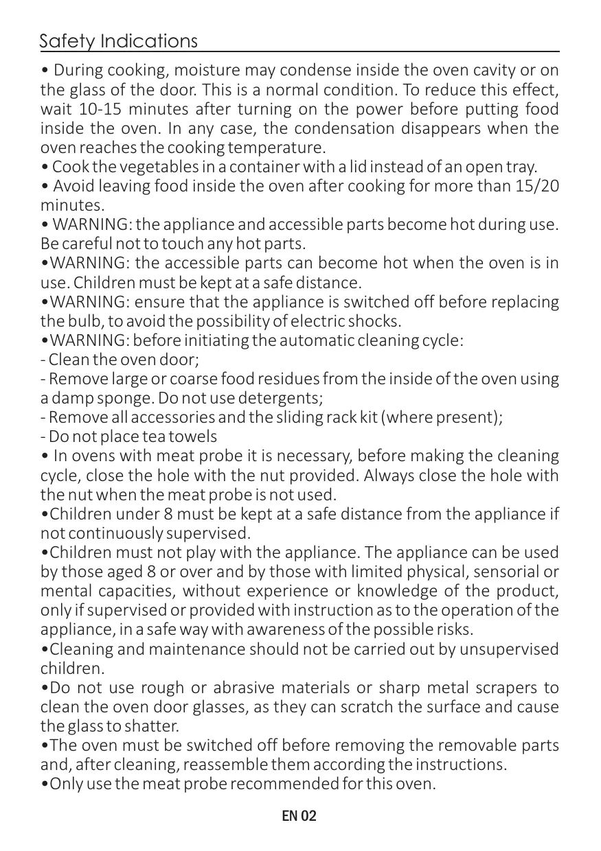 Safety Indications • During cooking, moisture may condense inside the oven cavity or on the glass of the door. This is a normal condition. To reduce this effect, wait 10-15 minutes after turning on the power before putting food inside the oven. In any case, the condensation disappears when the oven reaches the cooking temperature. • Cook the vegetables in a container with a lid instead of an open tray. • Avoid leaving food inside the oven after cooking for more than 15/20 minutes. • WARNING: the appliance and accessible parts become hot during use. Be careful not to touch any hot parts. •WARNING: the accessible parts can become hot when the oven is in use. Children must be kept at a safe distance. •WARNING: ensure that the appliance is switched off before replacing the bulb, to avoid the possibility of electric shocks. •WARNING: before initiating the automatic cleaning cycle: - Clean the oven door; - Remove large or coarse food residues from the inside of the oven using a damp sponge. Do not use detergents; - Remove all accessories and the sliding rack kit (where present); - Do not place tea towels • In ovens with meat probe it is necessary, before making the cleaning cycle, close the hole with the nut provided. Always close the hole with the nut when the meat probe is not used. •Children under 8 must be kept at a safe distance from the appliance if not continuously supervised. •Children must not play with the appliance. The appliance can be used by those aged 8 or over and by those with limited physical, sensorial or mental capacities, without experience or knowledge of the product, only if supervised or provided with instruction as to the operation of the appliance, in a safe way with awareness of the possible risks. •Cleaning and maintenance should not be carried out by unsupervised children. •Do not use rough or abrasive materials or sharp metal scrapers to clean the oven door glasses, as they can scratch the surface and cause the glass to shatter. •The oven must be switched off before removing the removable parts and, after cleaning, reassemble them according the instructions. •Only use the meat probe recommended for this oven. EN 02