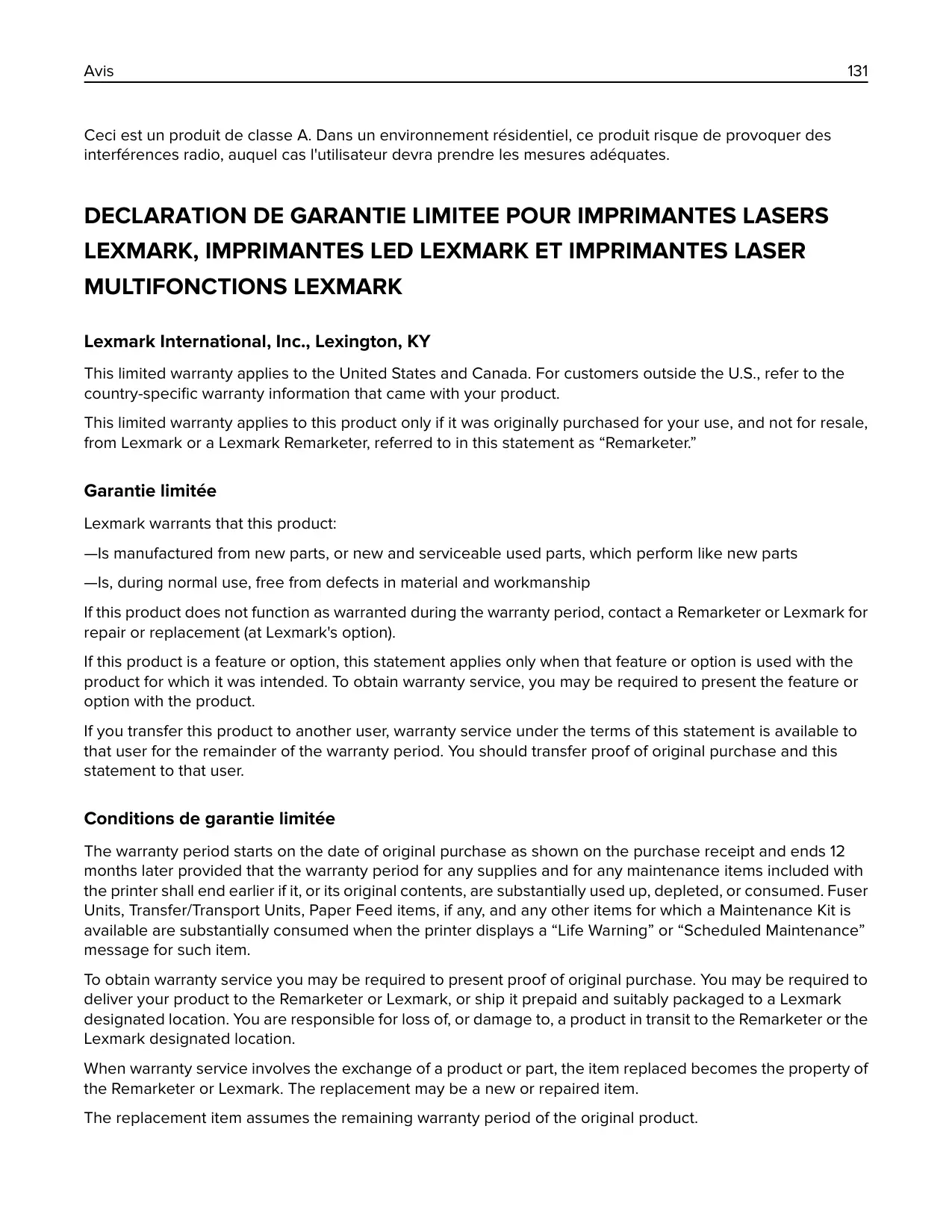 Conditions de garantie limitée The warranty period starts on the date of original purchase as shown on the purchase receipt and ends 12 months later provided that the warranty period for any supplies and for any maintenance items included with the printer shall end earlier if it, or its original contents, are substantially used up, depleted, or consumed. Fuser Units, Transfer/Transport Units, Paper Feed items, if any, and any other items for which a Maintenance Kit is available are substantially consumed when the printer displays a “Life Warning” or “Scheduled Maintenance” message for such item. To obtain warranty service you may be required to present proof of original purchase. You may be required to deliver your product to the Remarketer or Lexmark, or ship it prepaid and suitably packaged to a Lexmark designated location. You are responsible for loss of, or damage to, a product in transit to the Remarketer or the Lexmark designated location. When warranty service involves the exchange of a product or part, the item replaced becomes the property of the Remarketer or Lexmark. The replacement may be a new or repaired item. The replacement item assumes the remaining warranty period of the original product.