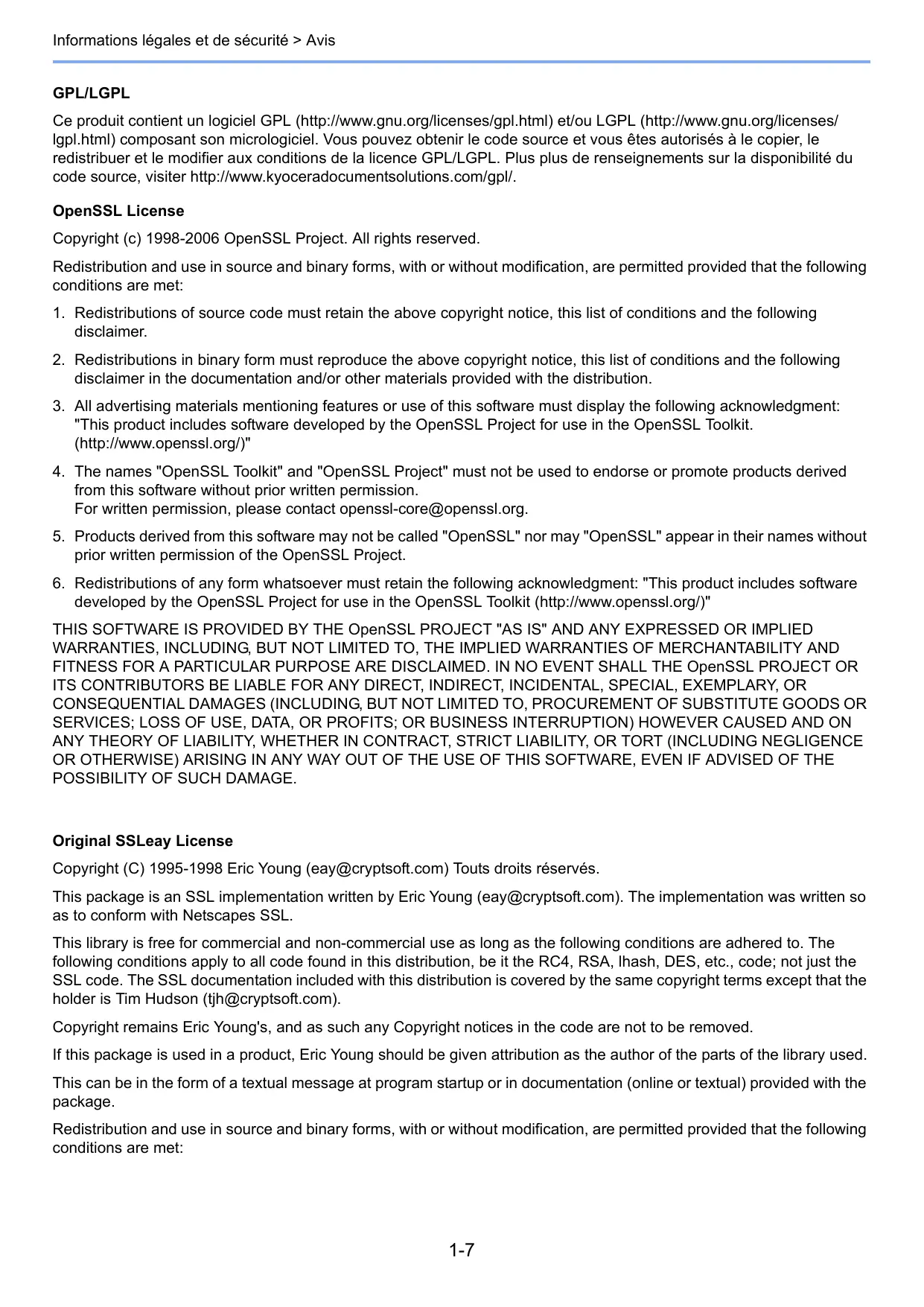 developed by the OpenSSL Project for use in the OpenSSL Toolkit (http://www.openssl.org/)" THIS SOFTWARE IS PROVIDED BY THE OpenSSL PROJECT "AS IS" AND ANY EXPRESSED OR IMPLIED WARRANTIES, INCLUDING, BUT NOT LIMITED TO, THE IMPLIED WARRANTIES OF MERCHANTABILITY AND FITNESS FOR A PARTICULAR PURPOSE ARE DISCLAIMED. IN NO EVENT SHALL THE OpenSSL PROJECT OR ITS CONTRIBUTORS BE LIABLE FOR ANY DIRECT, INDIRECT, INCIDENTAL, SPECIAL, EXEMPLARY, OR CONSEQUENTIAL DAMAGES (INCLUDING, BUT NOT LIMITED TO, PROCUREMENT OF SUBSTITUTE GOODS OR SERVICES; LOSS OF USE, DATA, OR PROFITS; OR BUSINESS INTERRUPTION) HOWEVER CAUSED AND ON ANY THEORY OF LIABILITY, WHETHER IN CONTRACT, STRICT LIABILITY, OR TORT (INCLUDING NEGLIGENCE OR OTHERWISE) ARISING IN ANY WAY OUT OF THE USE OF THIS SOFTWARE, EVEN IF ADVISED OF THE POSSIBILITY OF SUCH DAMAGE. Original SSLeay License Copyright (C) 1995-1998 Eric Young (eay@cryptsoft.com) Touts droits réservés. This package is an SSL implementation written by Eric Young (eay@cryptsoft.com). The implementation was written so as to conform with Netscapes SSL. This library is free for commercial and non-commercial use as long as the following conditions are adhered to. The following conditions apply to all code found in this distribution, be it the RC4, RSA, lhash, DES, etc., code; not just the SSL code. The SSL documentation included with this distribution is covered by the same copyright terms except that the holder is Tim Hudson (tjh@cryptsoft.com). Copyright remains Eric Young's, and as such any Copyright notices in the code are not to be removed. If this package is used in a product, Eric Young should be given attribution as the author of the parts of the library used. This can be in the form of a textual message at program startup or in documentation (online or textual) provided with the package. Redistribution and use in source and binary forms, with or without modification, are permitted provided that the following conditions are met: 1-7 Informations légales et de sécurité > Avis 1. Redistributions of source code must retain the copyright notice, this list of conditions and the following disclaimer.