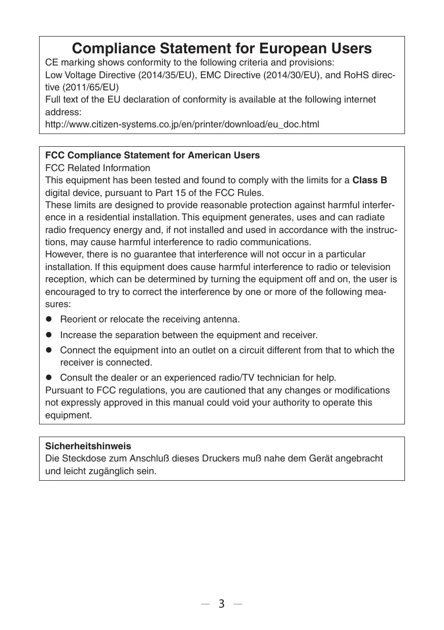 Compliance Statement for European Users CE marking shows conformity to the following criteria and provisions: Low Voltage Directive (2014/35/EU), EMC Directive (2014/30/EU), and RoHS directive (2011/65/EU) Full text of the EU declaration of conformity is available at the following internet address: http://www.citizen-systems.co.jp/en/printer/download/eu_doc.html FCC Compliance Statement for American Users FCC Related Information This equipment has been tested and found to comply with the limits for a Class B digital device, pursuant to Part 15 of the FCC Rules. These limits are designed to provide reasonable protection against harmful interference in a residential installation. This equipment generates, uses and can radiate radio frequency energy and, if not installed and used in accordance with the instructions, may cause harmful interference to radio communications. However, there is no guarantee that interference will not occur in a particular installation. If this equipment does cause harmful interference to radio or television reception, which can be determined by turning the equipment off and on, the user is encouraged to try to correct the interference by one or more of the following measures: Reorient or relocate the receiving antenna. Increase the separation between the equipment and receiver. Connect the equipment into an outlet on a circuit different from that to which the receiver is connected. Consult the dealer or an experienced radio/TV technician for help. Pursuant to FCC regulations, you are cautioned that any changes or modifications not expressly approved in this manual could void your authority to operate this equipment. Sicherheitshinweis Die Steckdose zum Anschluß dieses Druckers muß nahe dem Gerät angebracht und leicht zugänglich sein.