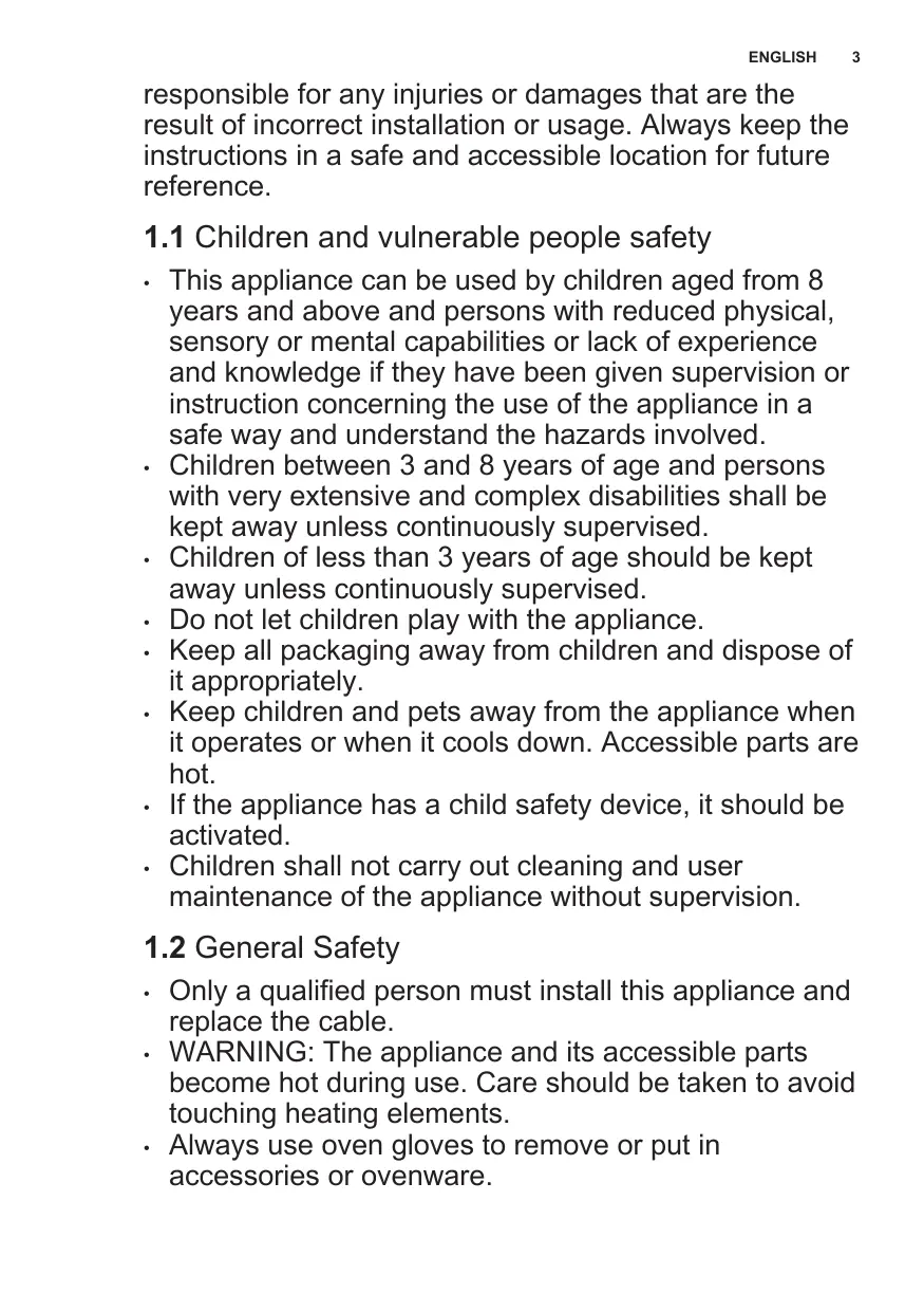 This appliance can be used by children aged from 8 years and above and persons with reduced physical, sensory or mental capabilities or lack of experience and knowledge if they have been given supervision or instruction concerning the use of the appliance in a safe way and understand the hazards involved. Children between 3 and 8 years of age and persons with very extensive and complex disabilities shall be kept away unless continuously supervised. Children of less than 3 years of age should be kept away unless continuously supervised. Do not let children play with the appliance. Keep all packaging away from children and dispose of it appropriately. Keep children and pets away from the appliance when it operates or when it cools down. Accessible parts are hot. If the appliance has a child safety device, it should be activated. Children shall not carry out cleaning and user maintenance of the appliance without supervision.