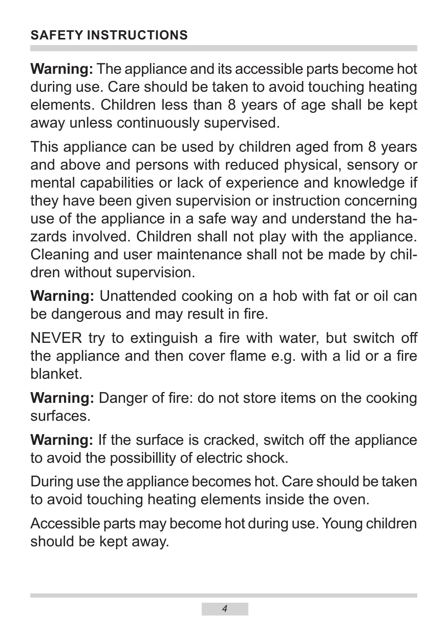 SAFETY INSTRUCTIONS © Always keep children away from the cooker. While in operation direct contact with the cooker may cause burns! © Ensure that small items of household equipment, including connection leads, do not touch the hot oven or the hob as the insulation material of this equipment is usually not resistant to high temperatures. e Do not leave the cooker unattended when frying. Oils and fats may catch fire due to overheating or boiling over. e Do not allow the hob to get soiled and prevent liquids from boiling over onto the surface of the hob. This refers in particular to sugar which can react with the ceramic hob and cause irreversible damage. Any spillages should be cleaned up as they happen. e Do not place pans with a wet bottom on the warmed up heating zones as this can cause irreversible changes to the hob (irremovable stains). e Use pans that are specified by the manufacturer as designed for use with a ceramic hob. © _lfany defects, deep scratches, cracks or chips appear on the ceramic hob, stop using the cooker immediately and contact the service centre. © Do not switch on the hob until a pan has been placed on it. e Do not use pans with sharp edges that may cause damage to the ceramic hob. e Do not look directly at the halogen heating zones (not covered by a pan) when they are warming Up. e Do not put pans weighing over 15 kg on the opened door of the oven and pans over 25 kg on the hob. e Do not use harsh cleaning agents or sharp metal objects to clean the door as they can scratch the surface, which could then result in the glass cracking. e Do not use the cooker in the event of a technical fault. Any faults must be fixed by an appropriately qualified and authorised person. © _Inthe event of any incident caused by a technical fault, disconnect the power and report the fault to the service centre to be repaired. © The rules and provisions contained in this instruction manual should be strictly observed. Do not allow anybody who is not familiar with the contents of this instruction manual to operate the cooker. © The appliance has been designed only for cooking. Any other use (for example for heat- ing) does not comply with its operating profile and may cause danger.