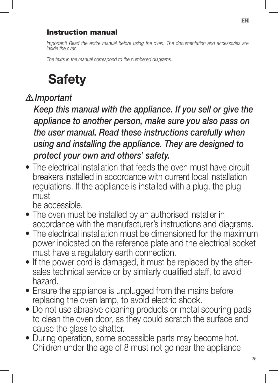 Keep this manual with the appliance. If you sell or give the appliance to another person, make sure you also pass on the user manual. Read these instructions carefully when using and installing the appliance. They are designed to protect your own and others’ safety. The electrical installation that feeds the oven must have circuit breakers installed in accordance with current local installation regulations. If the appliance is installed with a plug, the plug must be accessible. The oven must be installed by an authorised installer in accordance with the manufacturer’s instructions and diagrams. The electrical installation must be dimensioned for the maximum power indicated on the reference plate and the electrical socket must have a regulatory earth connection. If the power cord is damaged, it must be replaced by the aftersales technical service or by similarly qualified staff, to avoid hazard. Ensure the appliance is unplugged from the mains before replacing the oven lamp, to avoid electric shock. Do not use abrasive cleaning products or metal scouring pads to clean the oven door, as they could scratch the surface and cause the glass to shatter. During operation, some accessible parts may become hot. Children under the age of 8 must not go near the appliance 25