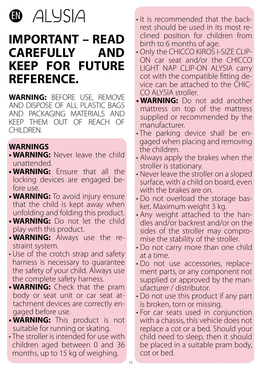 • It is recommended that the backrest should be used in its most reclined position for children from birth to 6 months of age. • Only the CHICCO KIROS I-SIZE CLIPON car seat and/or the CHICCO LIGHT NAP CLIP-ON ALYSIA carry cot with the compatible fitting device can be attached to the CHICCO ALYSIA stroller. • WARNING: Do not add another mattress on top of the mattress supplied or recommended by the manufacturer. • The parking device shall be engaged when placing and removing the children. • Always apply the brakes when the stroller is stationary. • Never leave the stroller on a sloped surface, with a child on board, even with the brakes are on. • Do not overload the storage basket. Maximum weight 3 kg. • Any weight attached to the handles and/or backrest and/or on the sides of the stroller may compromise the stability of the stroller. • Do not carry more than one child at a time. • Do not use accessories, replacement parts, or any component not supplied or approved by the manufacturer / distributor. • Do not use this product if any part is broken, torn or missing. • For car seats used in conjunction with a chassis, this vehicle does not replace a cot or a bed. Should your child need to sleep, then it should be placed in a suitable pram body, cot or bed.