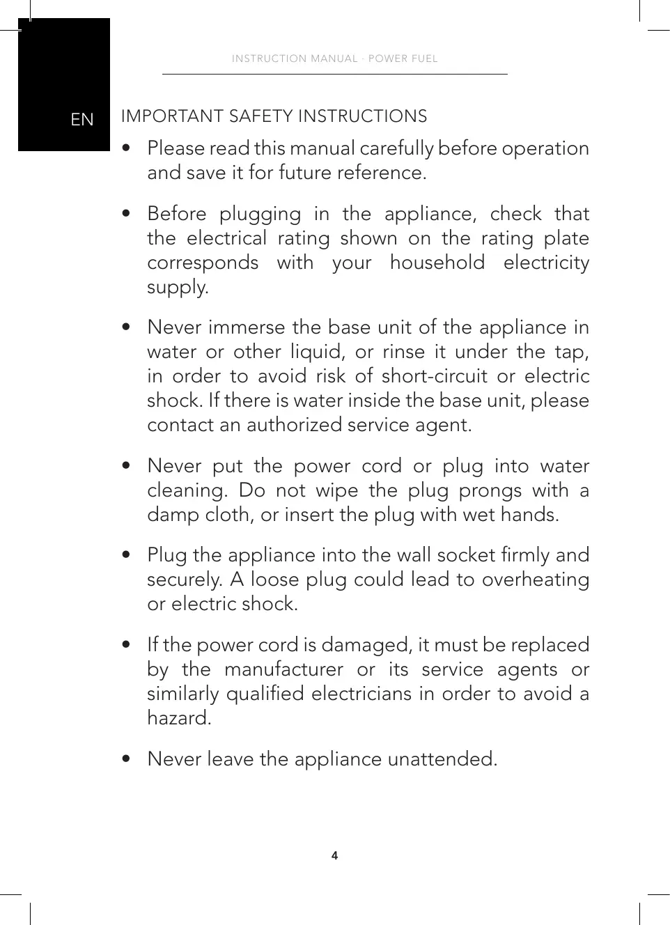 - Never immerse the base unit of the appliance in water or other liquid, or rinse it under the tap, in order to avoid risk of short-circuit or electric shock. If there is water inside the base unit, please contact an authorized service agent.