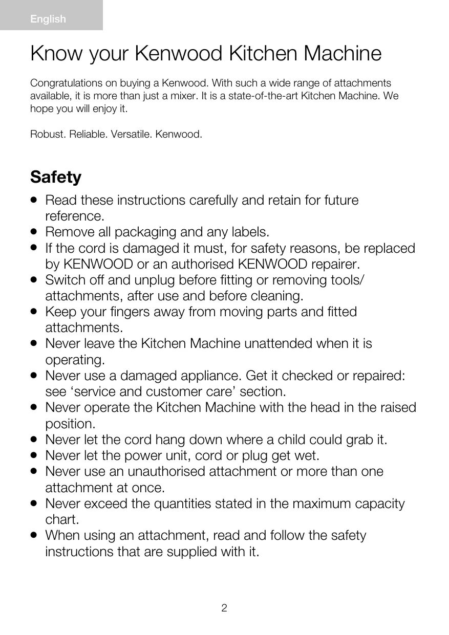 Know your Kenwood Kitchen Machine Congratulations on buying a Kenwood. With such a wide range of attachments available, it is more than just a mixer. It is a state-of-the-art Kitchen Machine. We hope you will enjoy it. Robust. Reliable. Versatile. Kenwood.