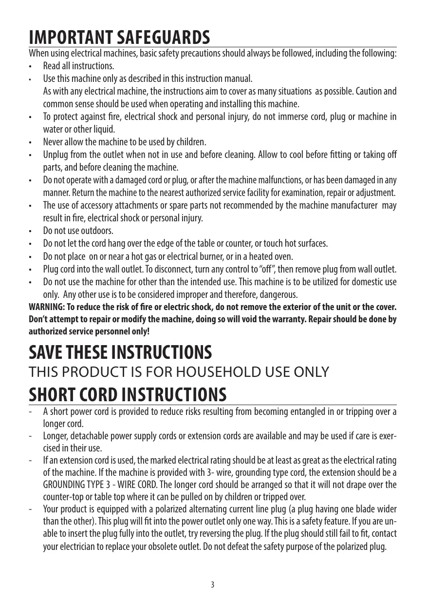 A short power cord is provided to reduce risks resulting from becoming entangled in or tripping over a longer cord. Longer, detachable power supply cords or extension cords are available and may be used if care is exercised in their use. If an extension cord is used, the marked electrical rating should be at least as great as the electrical rating of the machine. If the machine is provided with 3- wire, grounding type cord, the extension should be a GROUNDING TYPE 3 - WIRE CORD. The longer cord should be arranged so that it will not drape over the counter-top or table top where it can be pulled on by children or tripped over. Your product is equipped with a polarized alternating current line plug (a plug having one blade wider than the other). This plug will fit into the power outlet only one way. This is a safety feature. If you are unable to insert the plug fully into the outlet, try reversing the plug. If the plug should still fail to fit, contact your electrician to replace your obsolete outlet. Do not defeat the safety purpose of the polarized plug.