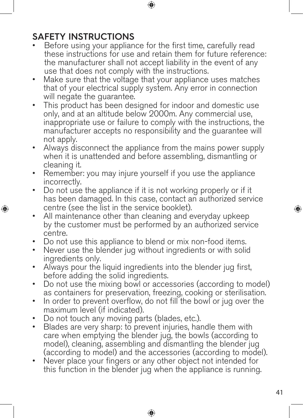 - Blades are very sharp: to prevent injuries, handle them with care when emptying the blender jug, the bowls (according to model), cleaning, assembling and dismantling the blender jug (according to model) and the accessories (according to model).