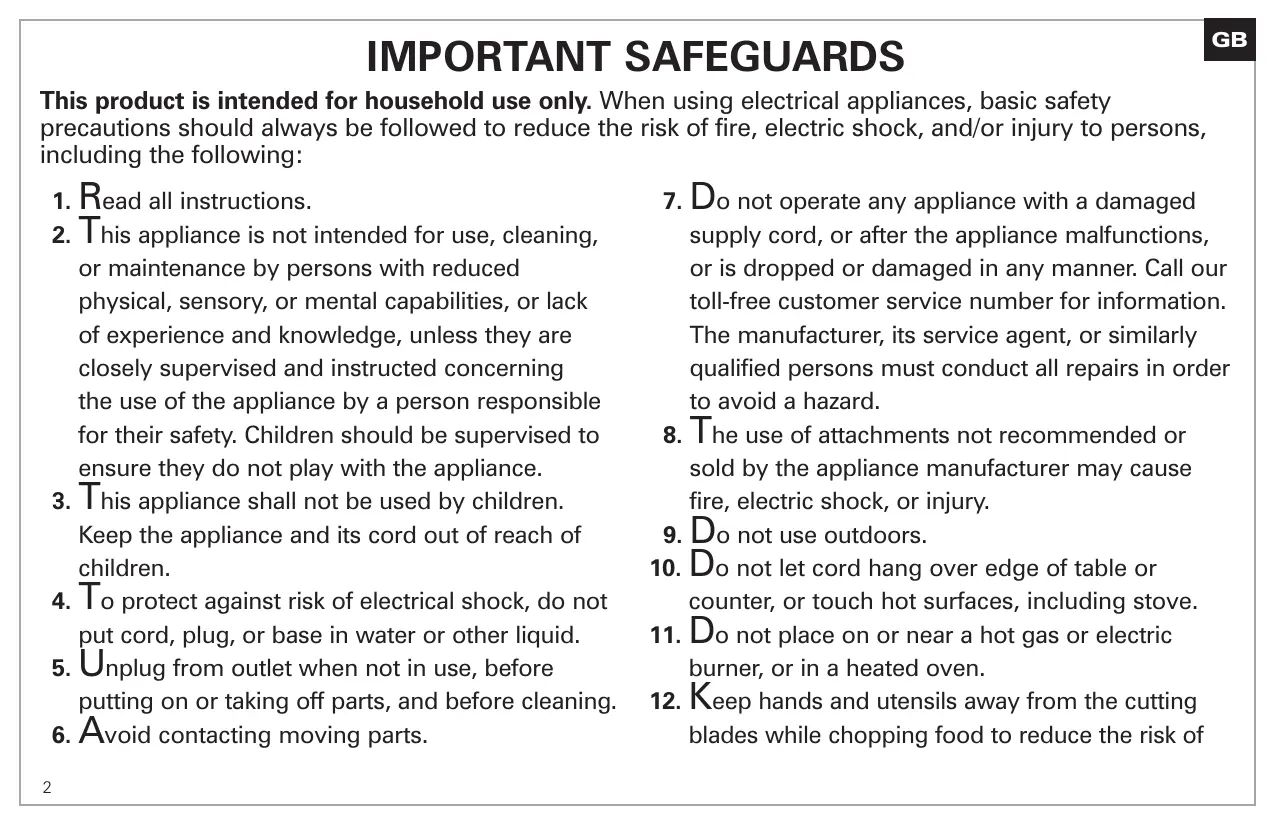 IMPORTANT SAFEGUARDS GB This product is intended for household use only. When using electrical appliances, basic safety precautions should always be followed to reduce the risk of fire, electric shock, and/or injury to persons, including the following: 1. R ead all instructions. 2. T his appliance is not intended for use, cleaning, or maintenance by persons with reduced physical, sensory, or mental capabilities, or lack of experience and knowledge, unless they are closely supervised and instructed concerning the use of the appliance by a person responsible for their safety. Children should be supervised to ensure they do not play with the appliance. 3. T his appliance shall not be used by children. Keep the appliance and its cord out of reach of children. 4. T o protect against risk of electrical shock, do not put cord, plug, or base in water or other liquid. 5. U nplug from outlet when not in use, before putting on or taking off parts, and before cleaning. 6. A void contacting moving parts. 2