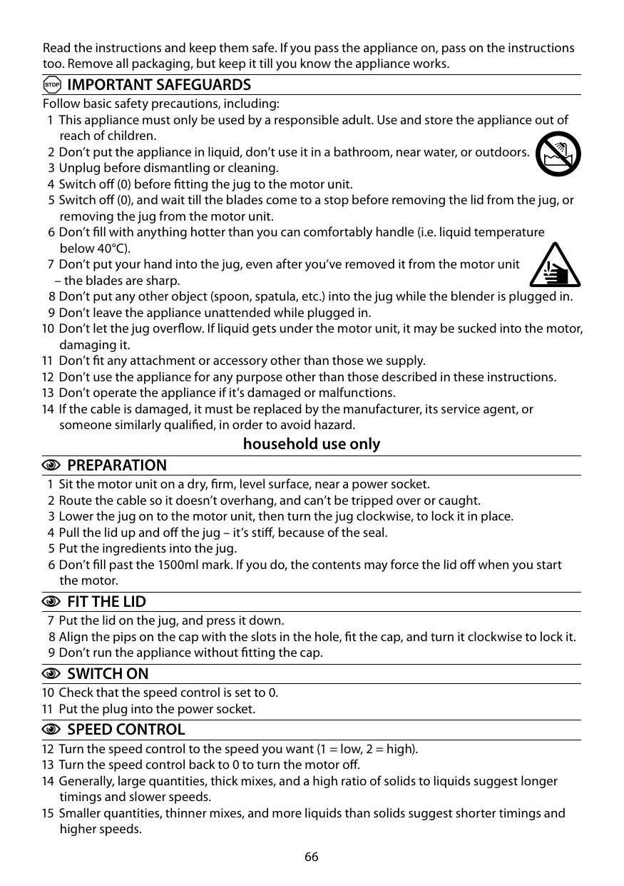 1 This appliance must only be used by a responsible adult. Use and store the appliance out of reach of children. 2 Don’t put the appliance in liquid, don’t use it in a bathroom, near water, or outdoors. 3 Unplug before dismantling or cleaning. 4 Switch off (0) before fitting the jug to the motor unit. 5 Switch off (0), and wait till the blades come to a stop before removing the lid from the jug, or removing the jug from the motor unit. 6 Don’t fill with anything hotter than you can comfortably handle (i.e. liquid temperature below 40°C). 7 Don’t put your hand into the jug, even after you’ve removed it from the motor unit – the blades are sharp. 8 Don’t put any other object (spoon, spatula, etc.) into the jug while the blender is plugged in. 9 Don’t leave the appliance unattended while plugged in. 10 Don’t let the jug overflow. If liquid gets under the motor unit, it may be sucked into the motor, damaging it. 11 Don’t fit any attachment or accessory other than those we supply. 12 Don’t use the appliance for any purpose other than those described in these instructions. 13 Don’t operate the appliance if it’s damaged or malfunctions. 14 If the cable is damaged, it must be replaced by the manufacturer, its service agent, or someone similarly qualified, in order to avoid hazard.