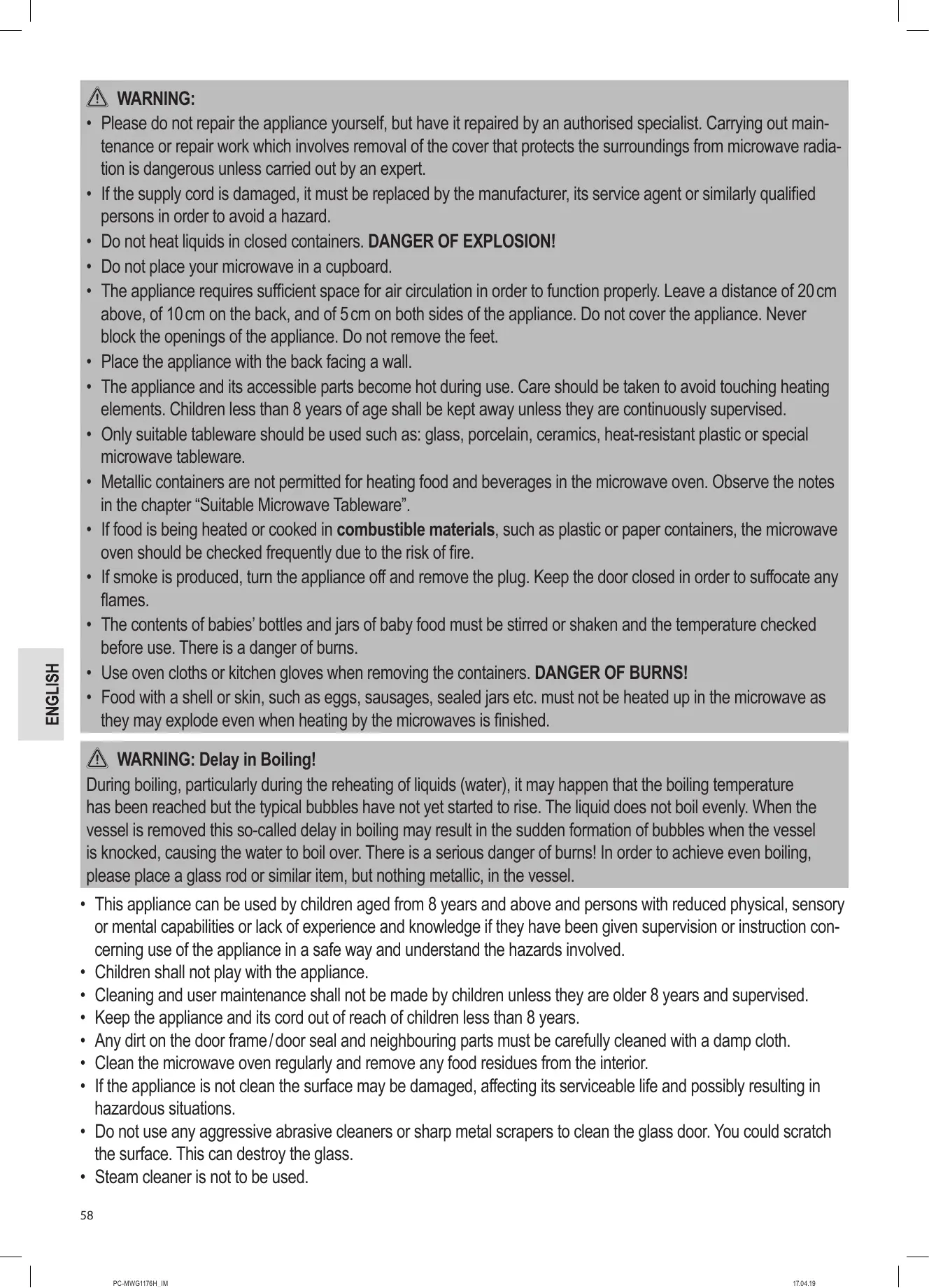 During boiling, particularly during the reheating of liquids (water), it may happen that the boiling temperature has been reached but the typical bubbles have not yet started to rise. The liquid does not boil evenly. When the vessel is removed this so-called delay in boiling may result in the sudden formation of bubbles when the vessel is knocked, causing the water to boil over. There is a serious danger of burns! In order to achieve even boiling, please place a glass rod or similar item, but nothing metallic, in the vessel. • This appliance can be used by children aged from 8 years and above and persons with reduced physical, sensory or mental capabilities or lack of experience and knowledge if they have been given supervision or instruction concerning use of the appliance in a safe way and understand the hazards involved. • Children shall not play with the appliance. • Cleaning and user maintenance shall not be made by children unless they are older 8 years and supervised. • Keep the appliance and its cord out of reach of children less than 8 years. • Any dirt on the door frame / door seal and neighbouring parts must be carefully cleaned with a damp cloth. • Clean the microwave oven regularly and remove any food residues from the interior. • If the appliance is not clean the surface may be damaged, affecting its serviceable life and possibly resulting in hazardous situations. • Do not use any aggressive abrasive cleaners or sharp metal scrapers to clean the glass door. You could scratch the surface. This can destroy the glass. • Steam cleaner is not to be used. 58