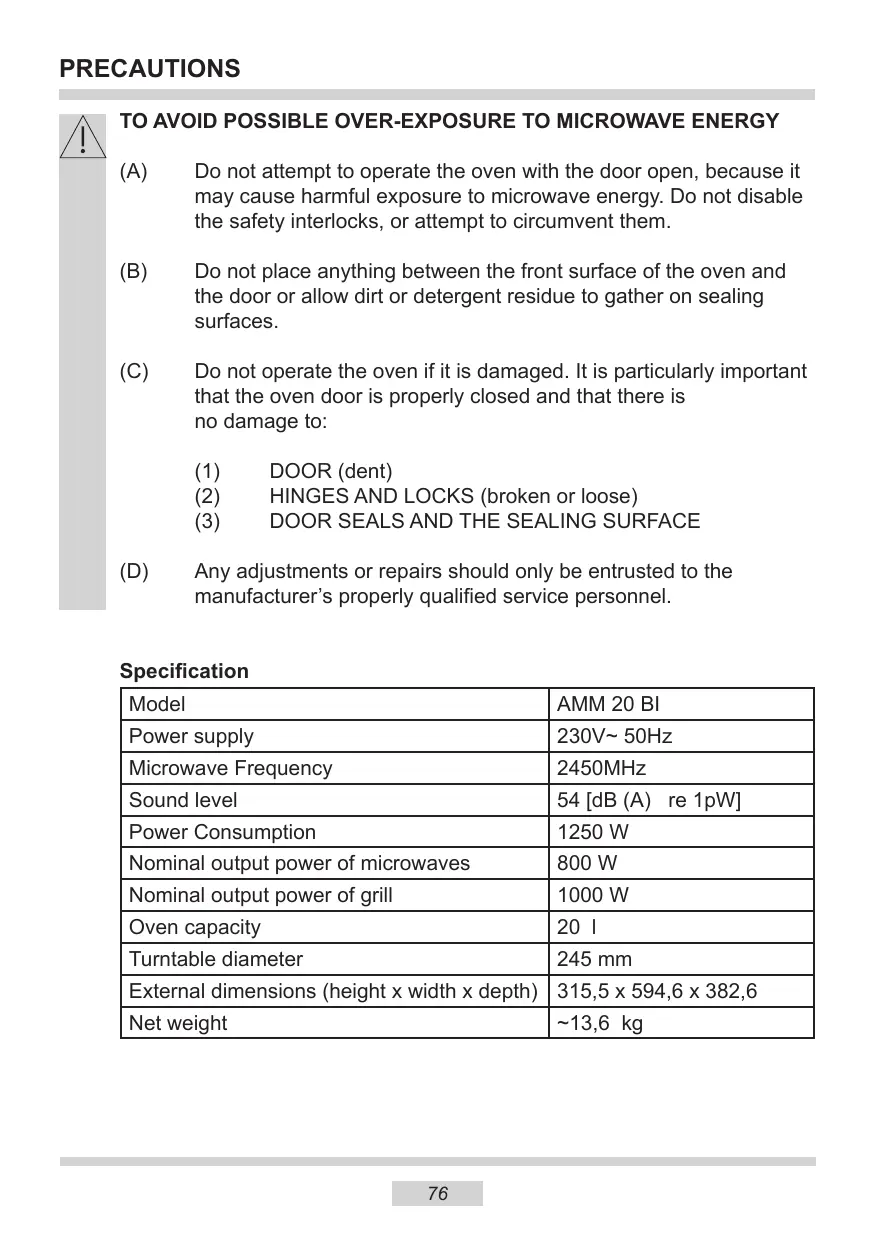PRECAUTIONS TO AVOID POSSIBLE OVER-EXPOSURE TO MICROWAVE ENERGY (A) Do not attempt to operate the oven with the door open, because it may cause harmful exposure to microwave energy. Do not disable the safety interlocks, or attempt to circumvent them. (B) Do not place anything between the front surface of the oven and the door or allow dirt or detergent residue to gather on sealing surfaces. (C) Do not operate the oven if it is damaged. It is particularly important that the oven door is properly closed and that there is no damage to: (1) (2) (3) (D) DOOR (dent) HINGES AND LOCKS (broken or loose)