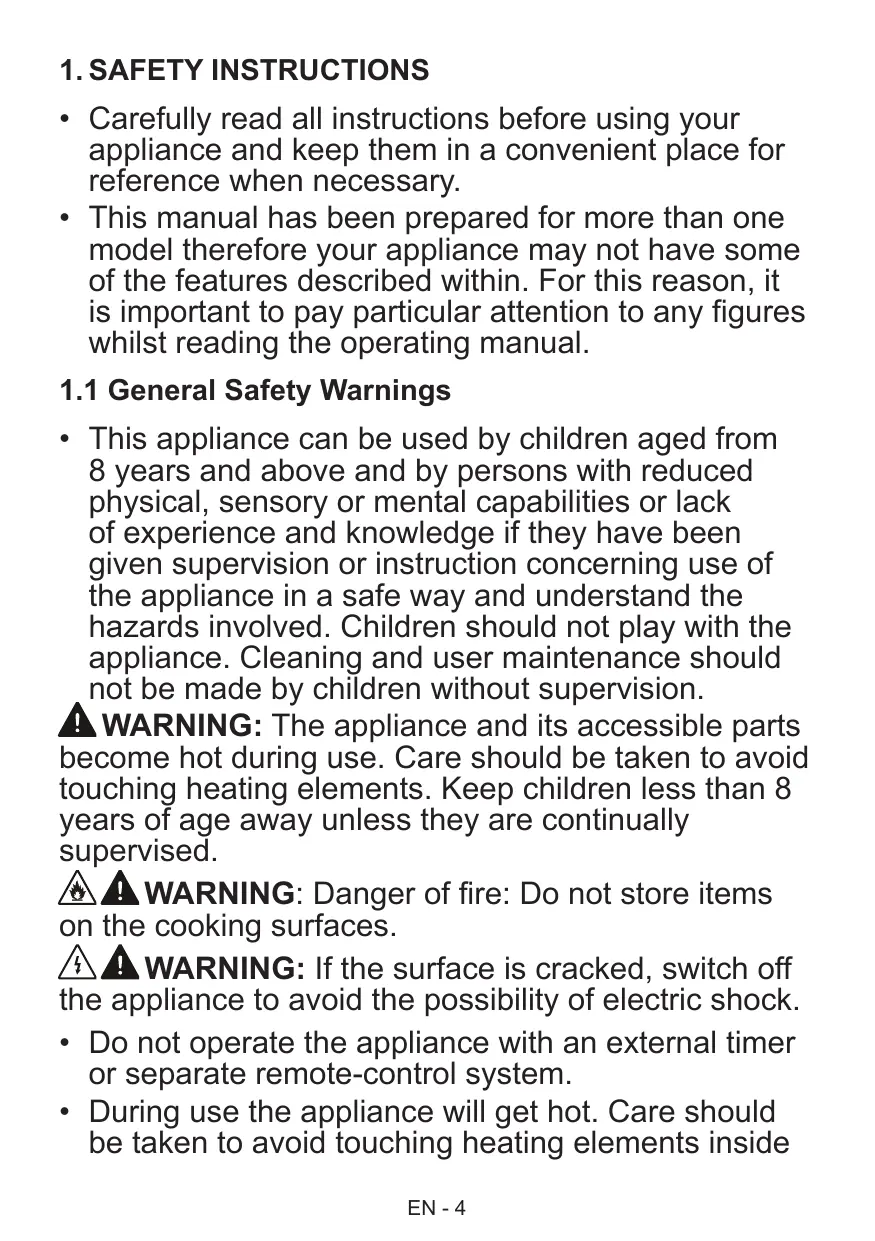 - During use the appliance will get hot. Care should be taken to avoid touching heating elements inside