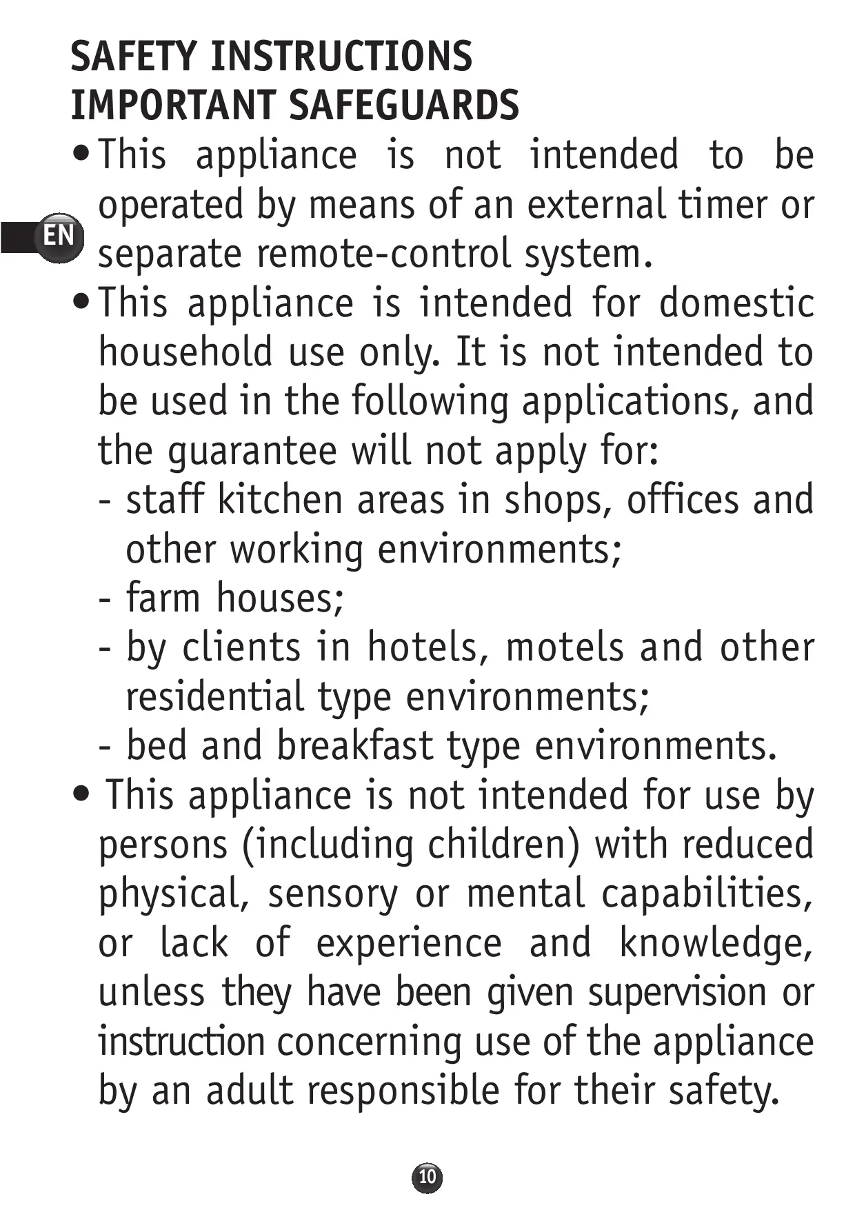• This appliance is not intended to be operated by means of an external timer or EN separate remote-control system. • This appliance is intended for domestic household use only. It is not intended to be used in the following applications, and the guarantee will not apply for: - staff kitchen areas in shops, offices and other working environments; - farm houses; - by clients in hotels, motels and other residential type environments; - bed and breakfast type environments. • This appliance is not intended for use by persons (including children) with reduced physical, sensory or mental capabilities, or lack of experience and knowledge, unless they have been given supervision or instruction concerning use of the appliance by an adult responsible for their safety. 10