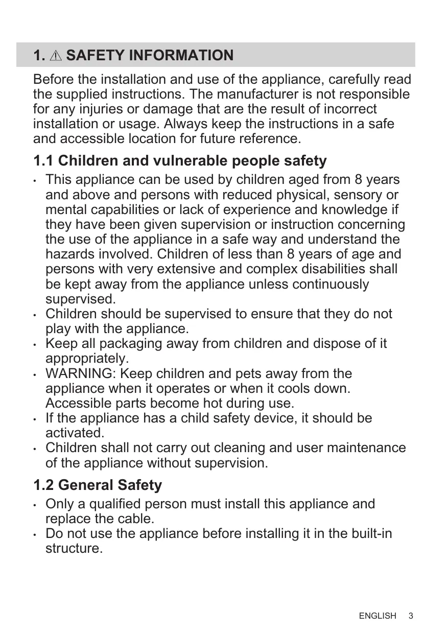 Children should be supervised to ensure that they do not play with the appliance. Keep all packaging away from children and dispose of it appropriately. WARNING: Keep children and pets away from the appliance when it operates or when it cools down. Accessible parts become hot during use. If the appliance has a child safety device, it should be activated. Children shall not carry out cleaning and user maintenance of the appliance without supervision.