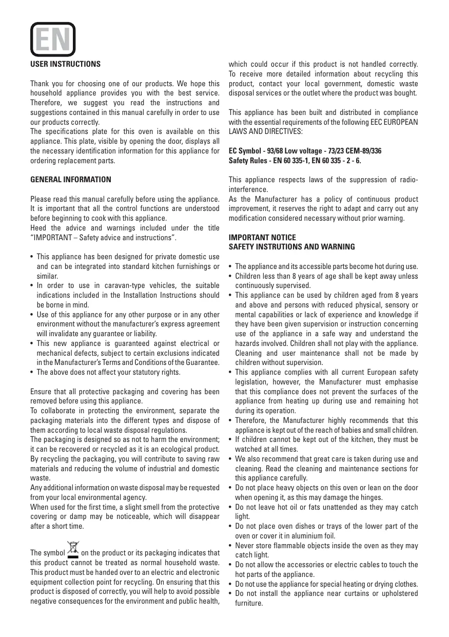 Therefore, we suggest you read the instructions and suggestions contained in this manual carefully in order to use our products correctly. The specifications plate for this oven is available on this appliance. This plate, visible by opening the door, displays all the necessary identification information for this appliance for ordering replacement parts. GENERAL INFORMATION Please read this manual carefully before using the appliance. It is important that all the control functions are understood before beginning to cook with this appliance. Heed the advice and warnings included under the title “IMPORTANT – Safety advice and instructions”. • This appliance has been designed for private domestic use and can be integrated into standard kitchen furnishings or similar. • In order to use in caravan-type vehicles, the suitable indications included in the Installation Instructions should be borne in mind. • Use of this appliance for any other purpose or in any other environment without the manufacturer’s express agreement will invalidate any guarantee or liability. • This new appliance is guaranteed against electrical or mechanical defects, subject to certain exclusions indicated in the Manufacturer’s Terms and Conditions of the Guarantee. • The above does not affect your statutory rights. Ensure that all protective packaging and covering has been removed before using this appliance. To collaborate in protecting the environment, separate the packaging materials into the different types and dispose of them according to local waste disposal regulations. The packaging is designed so as not to harm the environment; it can be recovered or recycled as it is an ecological product. By recycling the packaging, you will contribute to saving raw materials and reducing the volume of industrial and domestic waste. Any additional information on waste disposal may be requested from your local environmental agency. When used for the first time, a slight smell from the protective covering or damp may be noticeable, which will disappear after a short time. The symbol on the product or its packaging indicates that this product cannot be treated as normal household waste. This product must be handed over to an electric and electronic equipment collection point for recycling. On ensuring that this product is disposed of correctly, you will help to avoid possible negative consequences for the environment and public health,