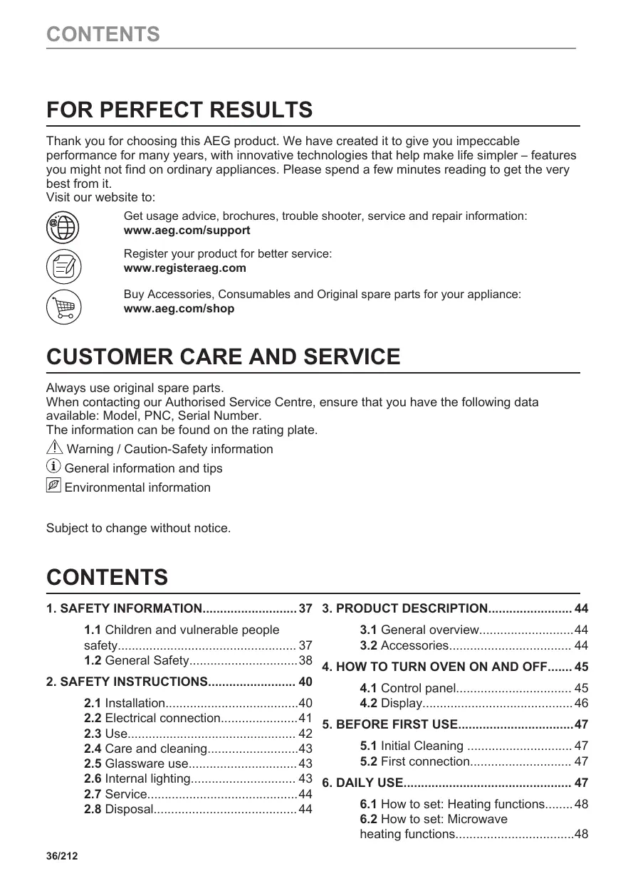 Thank you for choosing this AEG product. We have created it to give you impeccable performance for many years, with innovative technologies that help make life simpler – features you might not find on ordinary appliances. Please spend a few minutes reading to get the very best from it. Visit our website to: Get usage advice, brochures, trouble shooter, service and repair information: www.aeg.com/support Register your product for better service: www.registeraeg.com Buy Accessories, Consumables and Original spare parts for your appliance: www.aeg.com/shop