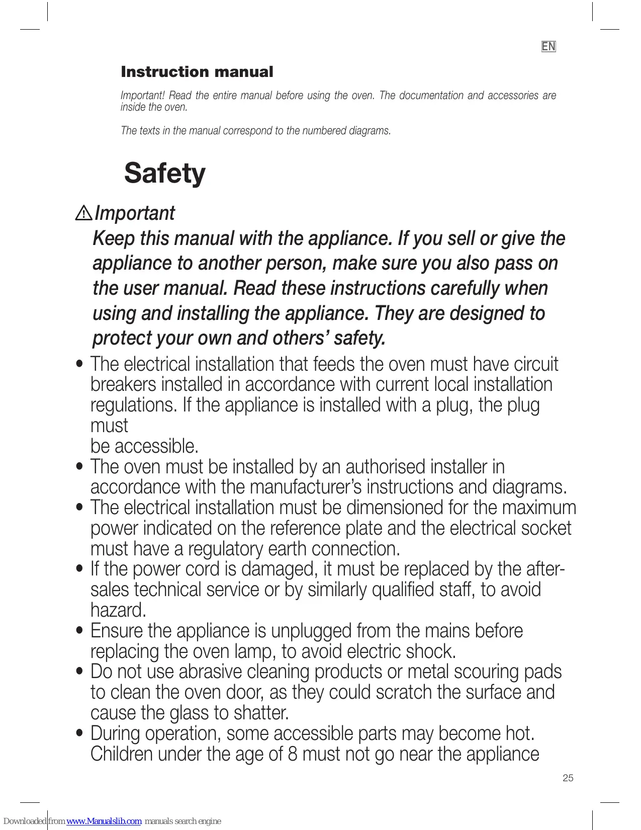 Keep this manual with the appliance. If you sell or give the appliance to another person, make sure you also pass on the user manual. Read these instructions carefully when using and installing the appliance. They are designed to protect your own and others’ safety. The electrical installation that feeds the oven must have circuit breakers installed in accordance with current local installation regulations. If the appliance is installed with a plug, the plug must be accessible. The oven must be installed by an authorised installer in accordance with the manufacturer’s instructions and diagrams. The electrical installation must be dimensioned for the maximum power indicated on the reference plate and the electrical socket must have a regulatory earth connection. If the power cord is damaged, it must be replaced by the aftersales technical service or by similarly qualified staff, to avoid hazard. Ensure the appliance is unplugged from the mains before replacing the oven lamp, to avoid electric shock. Do not use abrasive cleaning products or metal scouring pads to clean the oven door, as they could scratch the surface and cause the glass to shatter. During operation, some accessible parts may become hot. Children under the age of 8 must not go near the appliance 25