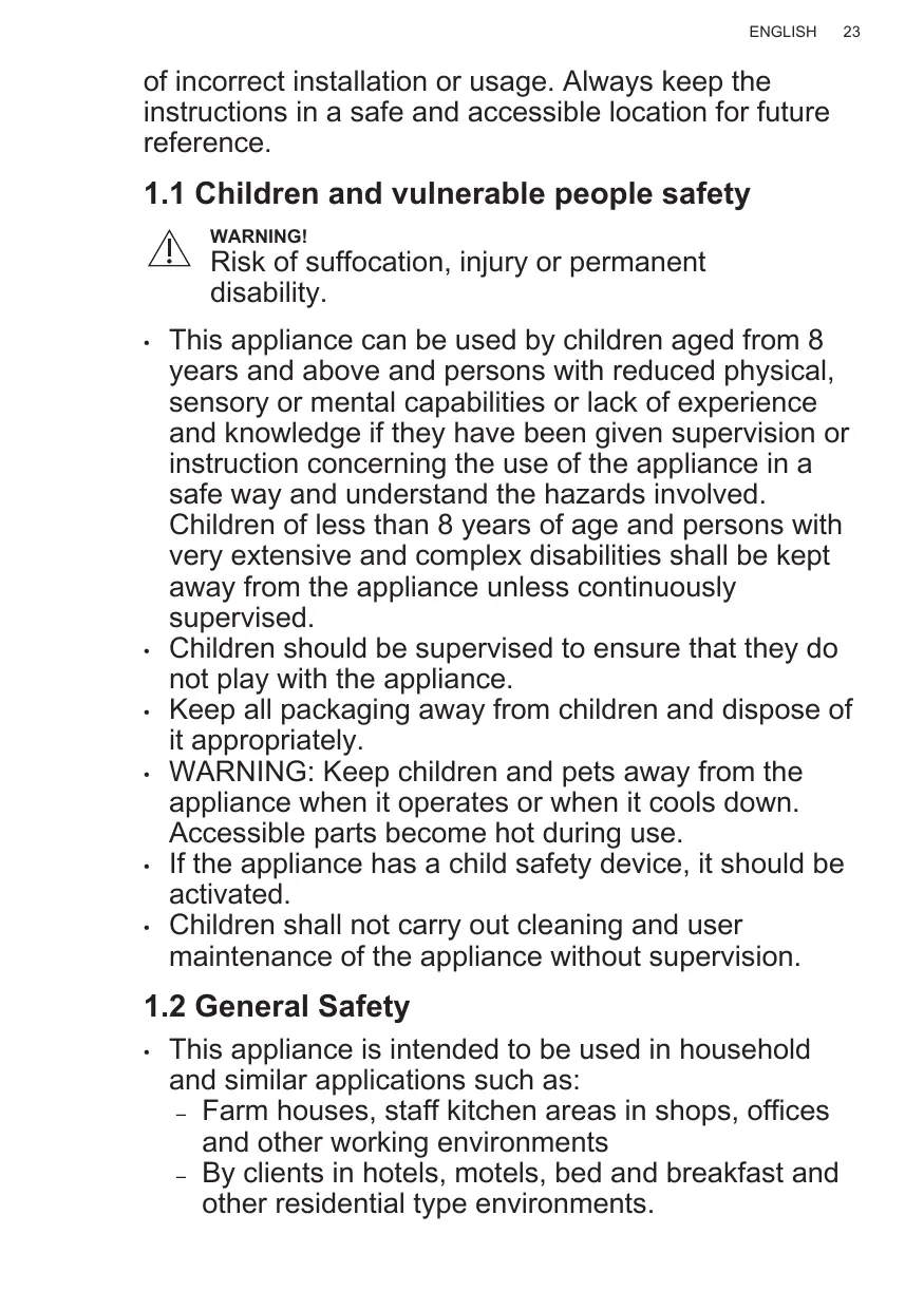 This appliance can be used by children aged from 8 years and above and persons with reduced physical, sensory or mental capabilities or lack of experience and knowledge if they have been given supervision or instruction concerning the use of the appliance in a safe way and understand the hazards involved. Children of less than 8 years of age and persons with very extensive and complex disabilities shall be kept away from the appliance unless continuously supervised. Children should be supervised to ensure that they do not play with the appliance. Keep all packaging away from children and dispose of it appropriately.