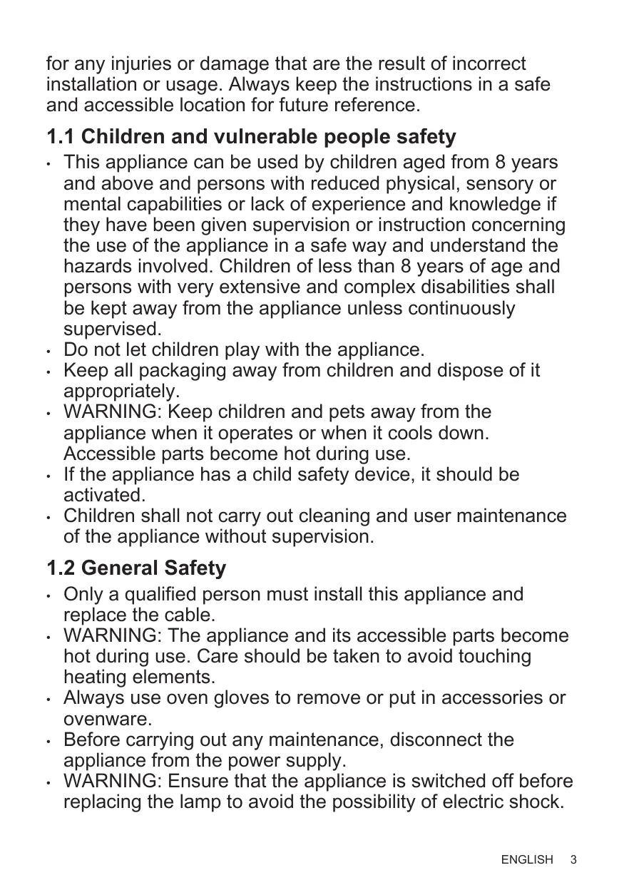 - This appliance can be used by children aged from 8 years and above and persons with reduced physical, sensory or mental capabilities or lack of experience and knowledge if they have been given supervision or instruction concerning the use of the appliance in a safe way and understand the hazards involved. Children of less than 8 years of age and persons with very extensive and complex disabilities shall be kept away from the appliance unless continuously supervised.