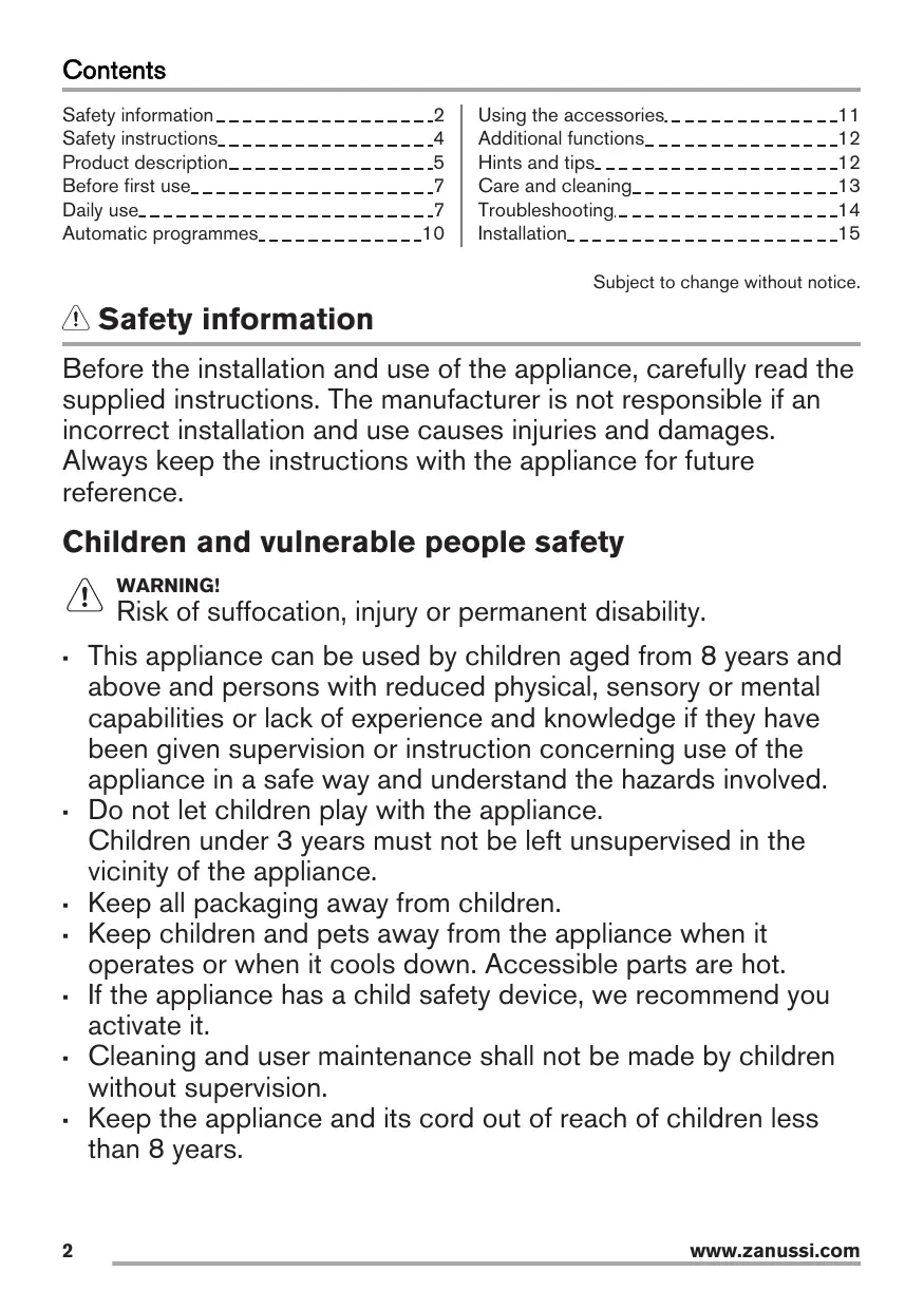 Subject to change without notice. Safety information Before the installation and use of the appliance, carefully read the supplied instructions. The manufacturer is not responsible if an incorrect installation and use causes injuries and damages. Always keep the instructions with the appliance for future reference. Children and vulnerable people safety WARNING! Risk of suffocation, injury or permanent disability.