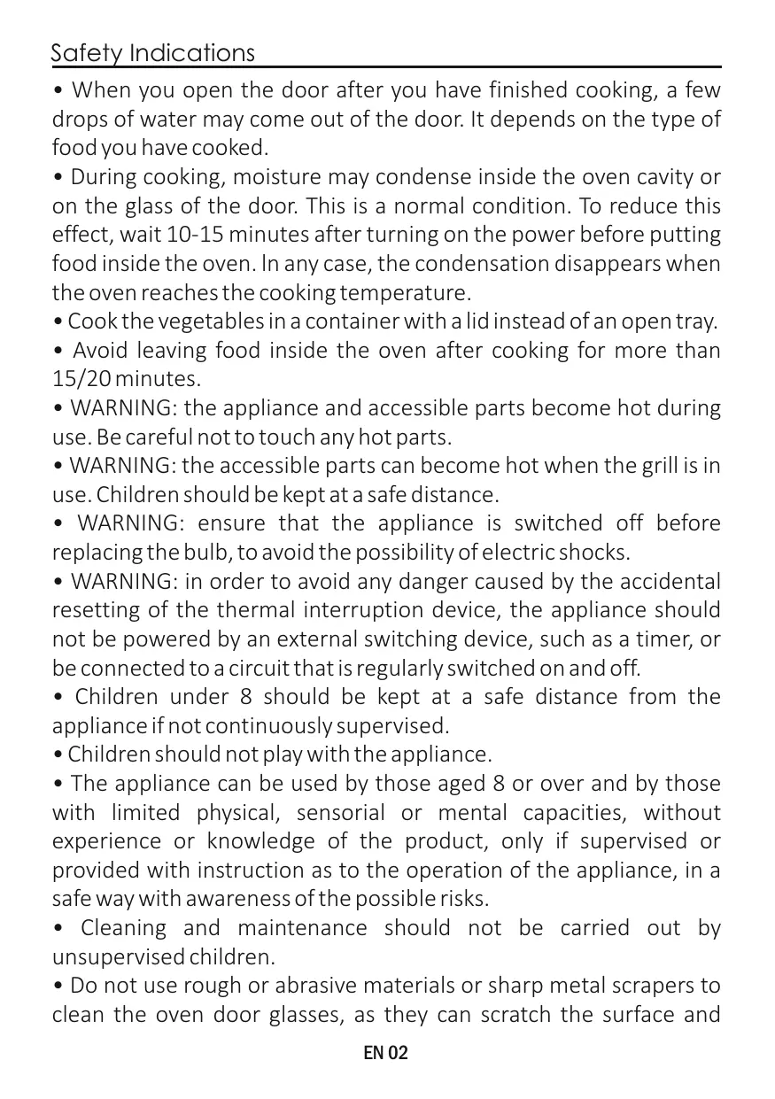• Do not use rough or abrasive materials or sharp metal scrapers to clean the oven door glasses, as they can scratch the surface and EN 02 cause the glass to shatter.