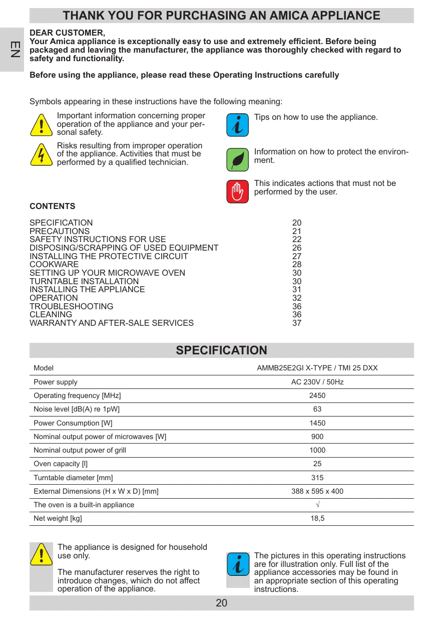 Your Amica appliance is exceptionally easy to use and extremely efficient. Before being packaged and leaving the manufacturer, the appliance was thoroughly checked with regard to safety and functionality.