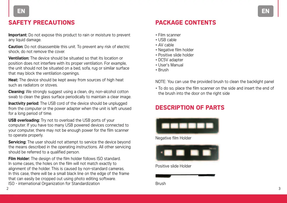 • Brush Caution: Do not disassemble this unit. To prevent any risk of electric shock, do not remove the cover. Ventilation: The device should be situated so that its location or position does not interfere with its proper ventilation. For example, the unit should not be situated on a bed, sofa, rug or similar surface that may block the ventilation openings. Heat: The device should be kept away from sources of high heat such as radiators or stoves. Cleaning: We strongly suggest using a clean, dry, non-alcohol cotton swab to clean the glass surface periodically to maintain a clear image. Inactivity period: The USB cord of the device should be unplugged from the computer or the power adapter when the unit is left unused for a long period of time. USB overloading: Try not to overload the USB ports of your computer. If you have too many USB powered devices connected to your computer, there may not be enough power for the film scanner to operate properly. Servicing: The user should not attempt to service the device beyond the means described in the operating instructions. All other servicing should be referred to a qualified person. Film Holder: The design of the film holder follows ISO standard. In some cases, the holes on the film will not match exactly to alignment of the holder. This is caused by non-standard cameras. In this case, there will be a small black line on the edge of the frame that can easily be cropped out using photo editing software. ISO - international Organization for Standardization
