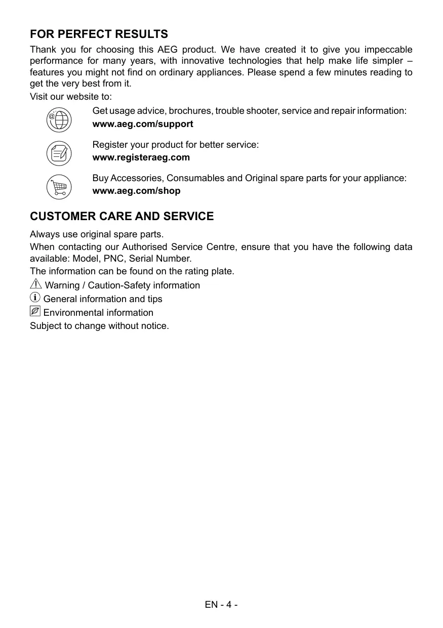 Thank you for choosing this AEG product. We have created it to give you impeccable performance for many years, with innovative technologies that help make life simpler – features you might not find on ordinary appliances. Please spend a few minutes reading to get the very best from it. Visit our website to: Get usage advice, brochures, trouble shooter, service and repair information: www.aeg.com/support Register your product for better service: www.registeraeg.com Buy Accessories, Consumables and Original spare parts for your appliance: www.aeg.com/shop