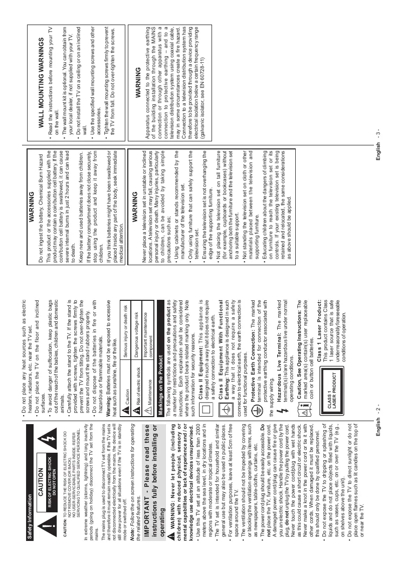 Class 1 Laser Product: This product contains Class 1 laser source that is safe under reasonably foreseeable conditions of operation. Caution, See Operating Instructions: The marked area(s) contain(s) user replaceable coin or button cell batteries.