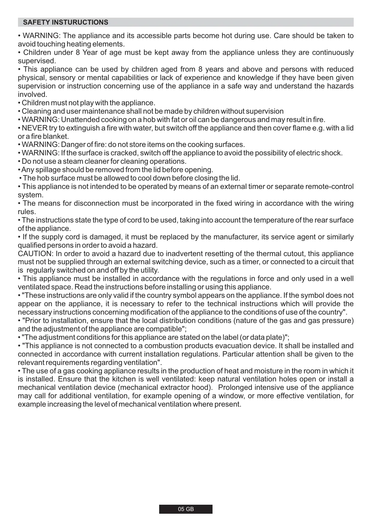 - The use of a gas cooking appliance results in the production of heat and moisture in the room in which it is installed. Ensure that the kitchen is well ventilated: keep natural ventilation holes open or install a mechanical ventilation device (mechanical extractor hood). Prolonged intensive use of the appliance may call for additional ventilation, for example opening of a window, or more effective ventilation, for example increasing the level of mechanical ventilation where present. 05 GB