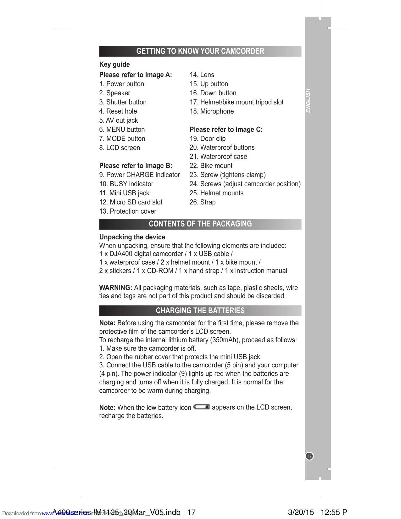 When unpacking, ensure that the following elements are included: 1 x DJA400 digital camcorder / 1 x USB cable / 1 x waterproof case / 2 x helmet mount / 1 x bike mount / 2 x stickers / 1 x CD-ROM / 1 x hand strap / 1 x instruction manual WARNING: All packaging materials, such as tape, plastic sheets, wire ties and tags are not part of this product and should be discarded.