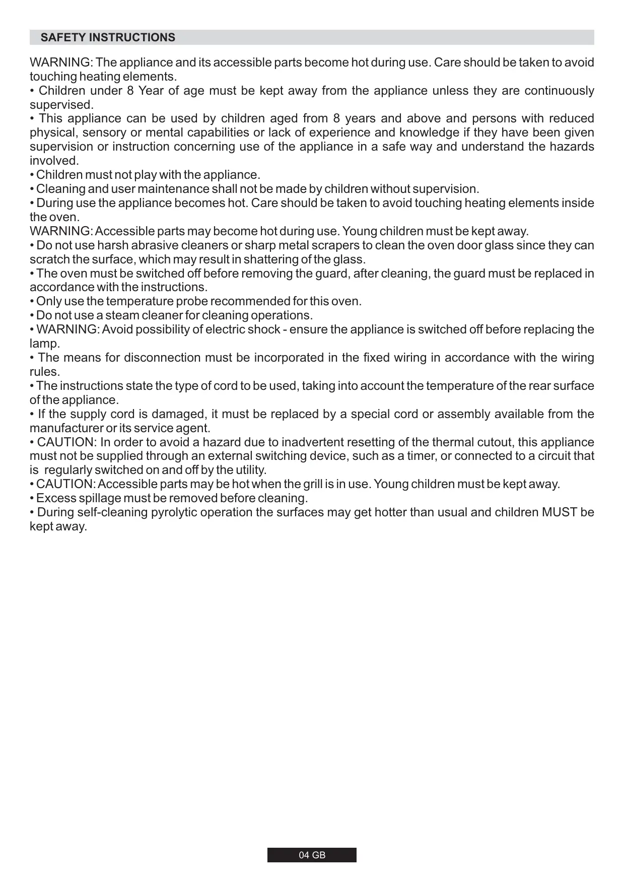 - During self-cleaning pyrolytic operation the surfaces may get hotter than usual and children MUST be kept away. 04 GB