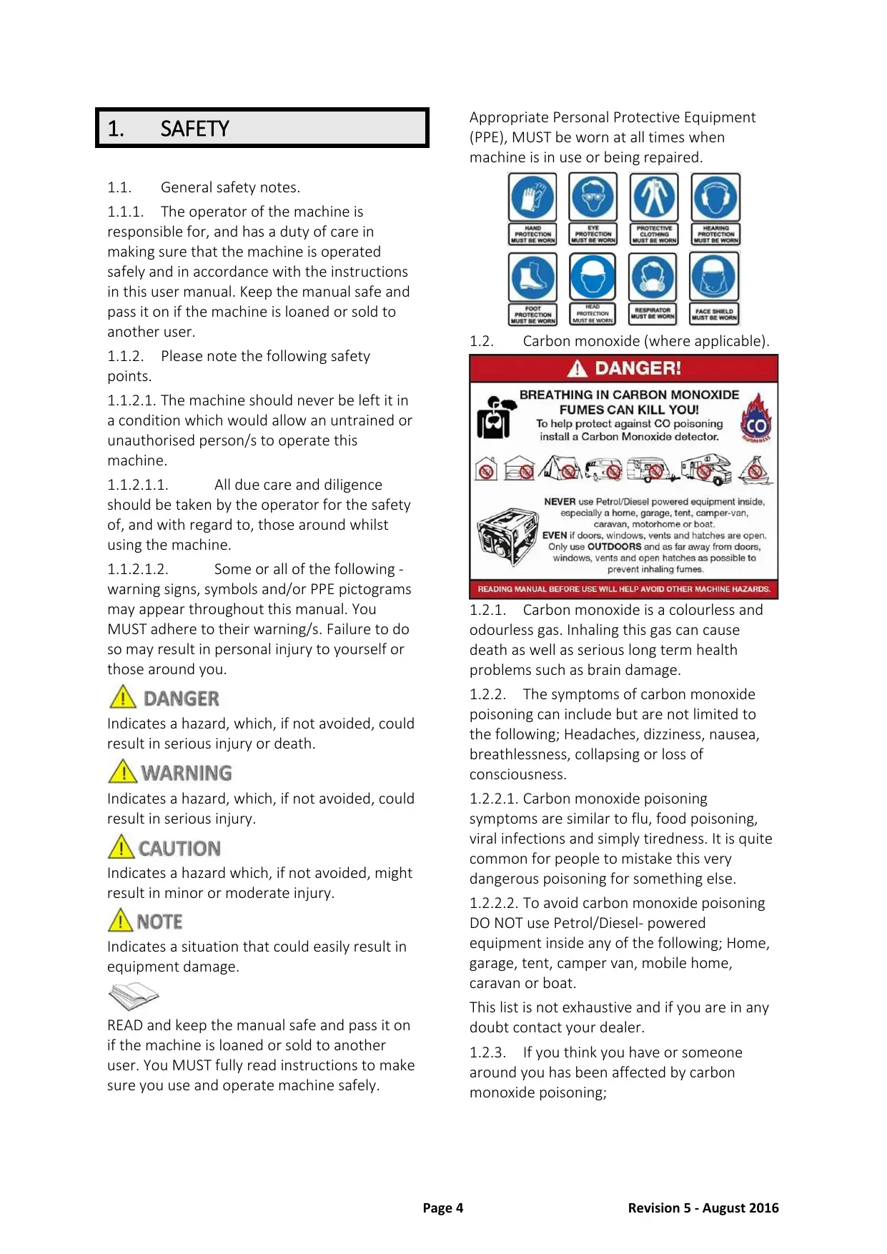 around you has been affected by carbon monoxide poisoning; Indicates a hazard, which, if not avoided, could result in serious injury or death. Indicates a hazard, which, if not avoided, could result in serious injury. Indicates a hazard which, if not avoided, might result in minor or moderate injury. Indicates a situation that could easily result in equipment damage. READ and keep the manual safe and pass it on if the machine is loaned or sold to another user. You MUST fully read instructions to make sure you use and operate machine safely. Page 4 Revision 5 - August 2016